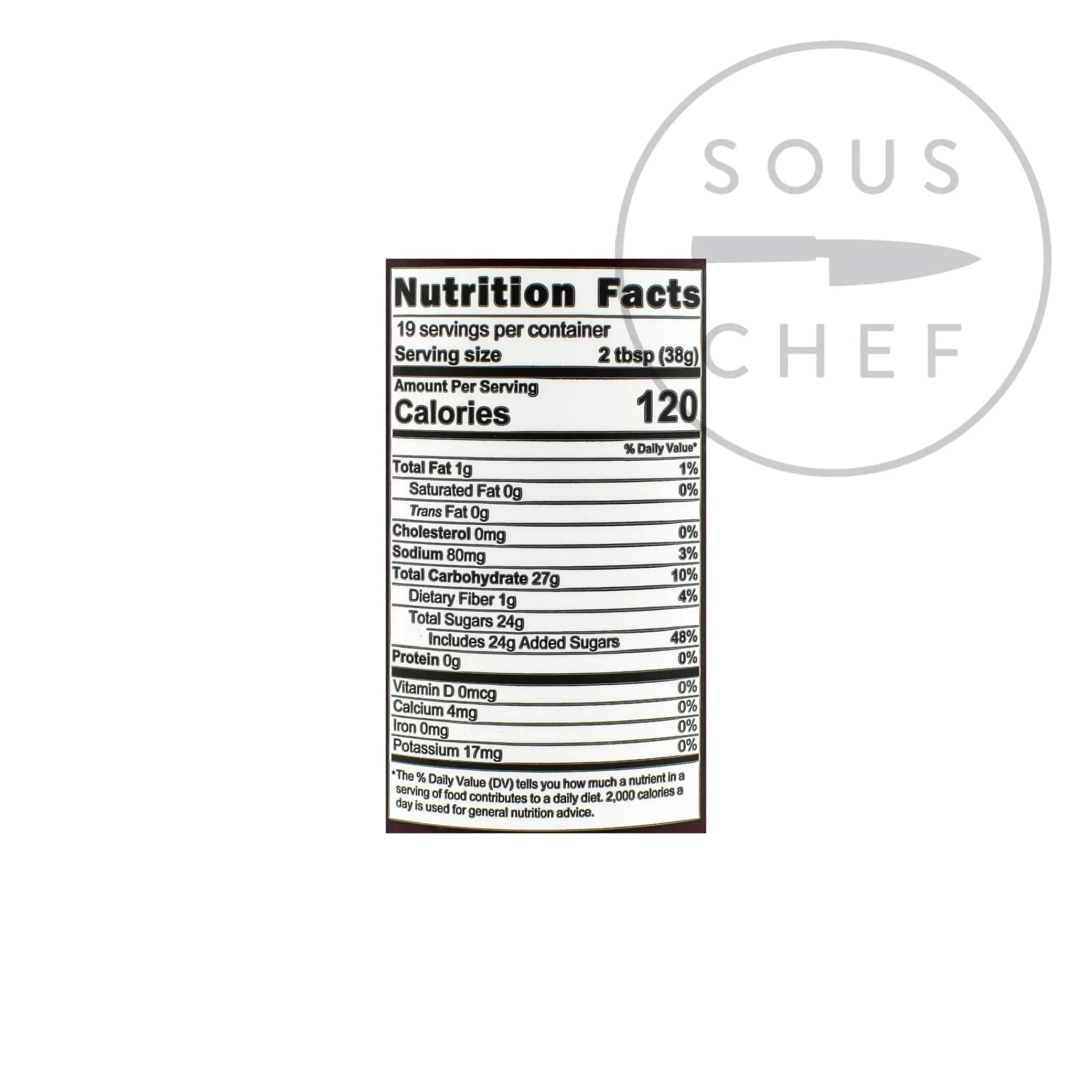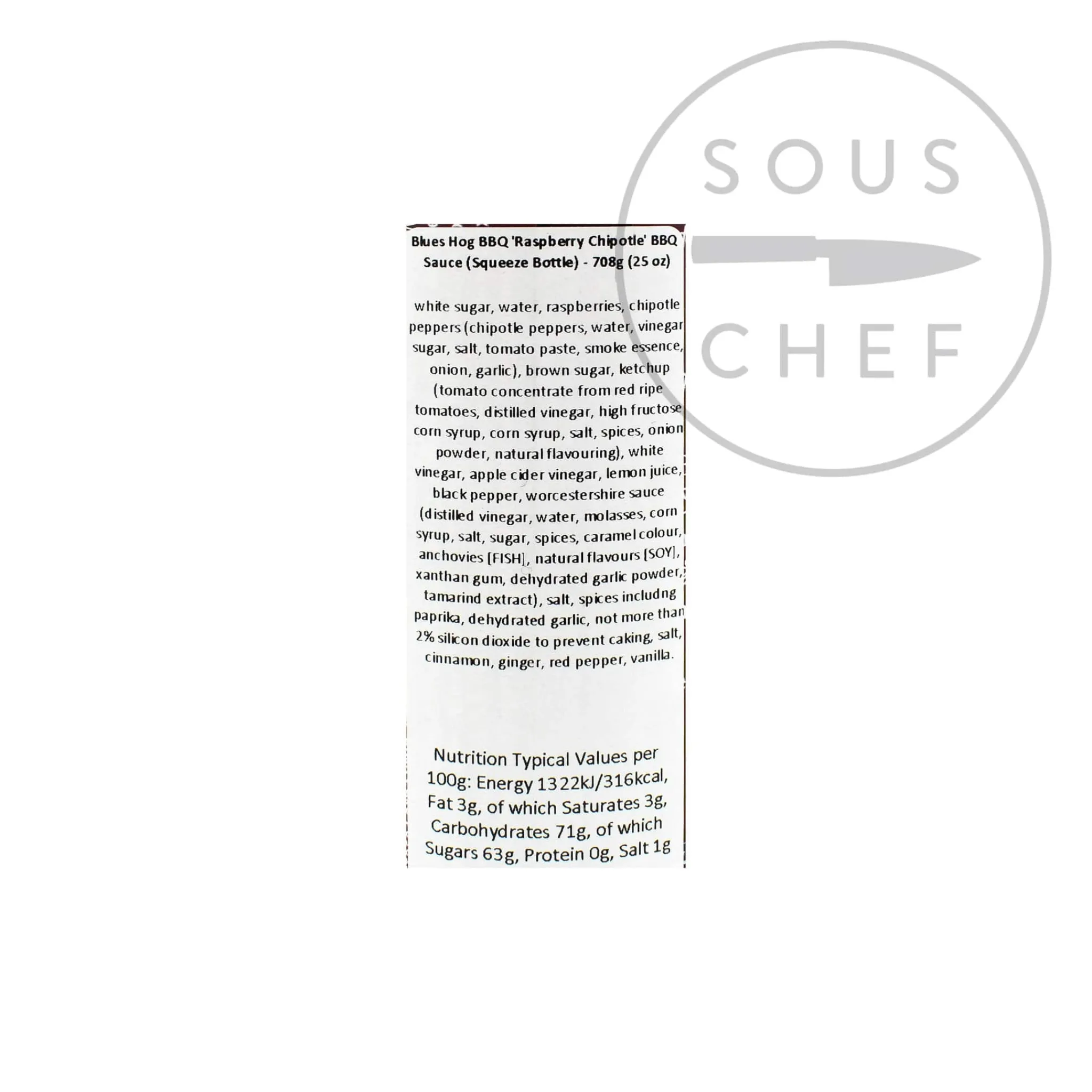 Product formulations and details may change. For the latest ingredients and allergen information always check product packaging prior to consumption. Ingredients: White sugar, water, raspberries, chipotle peppers (chipotle peppers, water, vinegar, sugar, salt, tomato paste, smoke essence, onion, garlic), brown sugar, ketchup (tomato concentrate from red ripe tomatoes, distilled vinegar, high fructose corn syrup, corn syrup, salt, spice, onion powder, natural flavouring), white vinegar, apple cider vinegar, lemon juice, black pepper, worcestershire sauce (distilled vinegar, water, molasses, corn syrup, salt, sugar, spices, caramel colour, anchovies [fish], natural flavours [soy], xanthan gum, dehydrated garlic powder, not more than 2% silicon dioxide to prevent caking, salt, cinnamon, red pepper, vanilla.