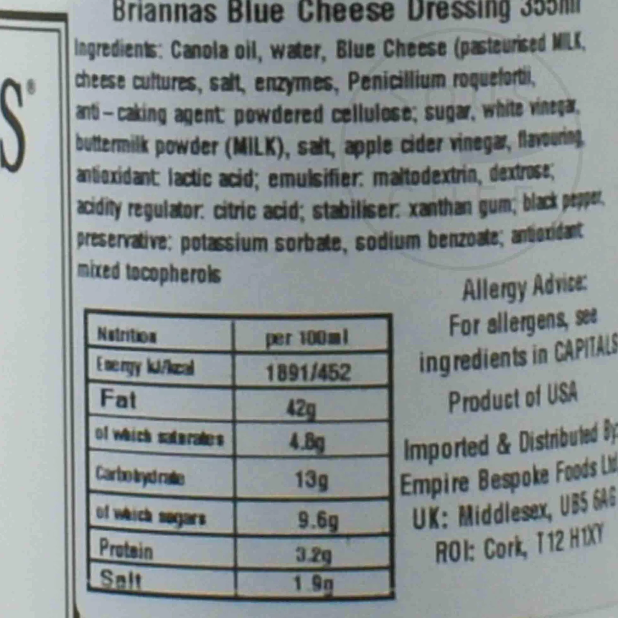 Briannas blue cheese dressing is a thick and creamy dressing for chopped green salads. It’s made from all-natural ingredients and contains pieces of sharp, salty blue cheese. Use it to dress iceberg wedges sprinkled with bacon bits or as a dip for chicken wings smothered in hot sauce.