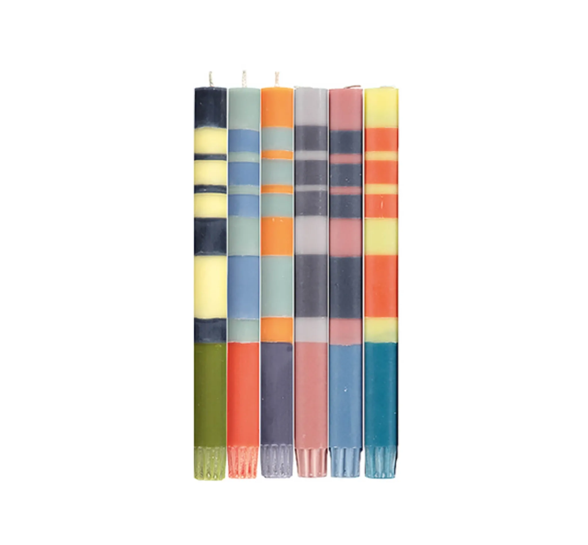 This set of 6 striped dinner candles in warm tones add comforting mellow colours to your home decor. Designed with irregular stripes of British Colour Standard shades, the muted tones add subtle pops of colour. Baby blues complement faded navy, and pinky taupes sit alongside lemon yellow and orange.