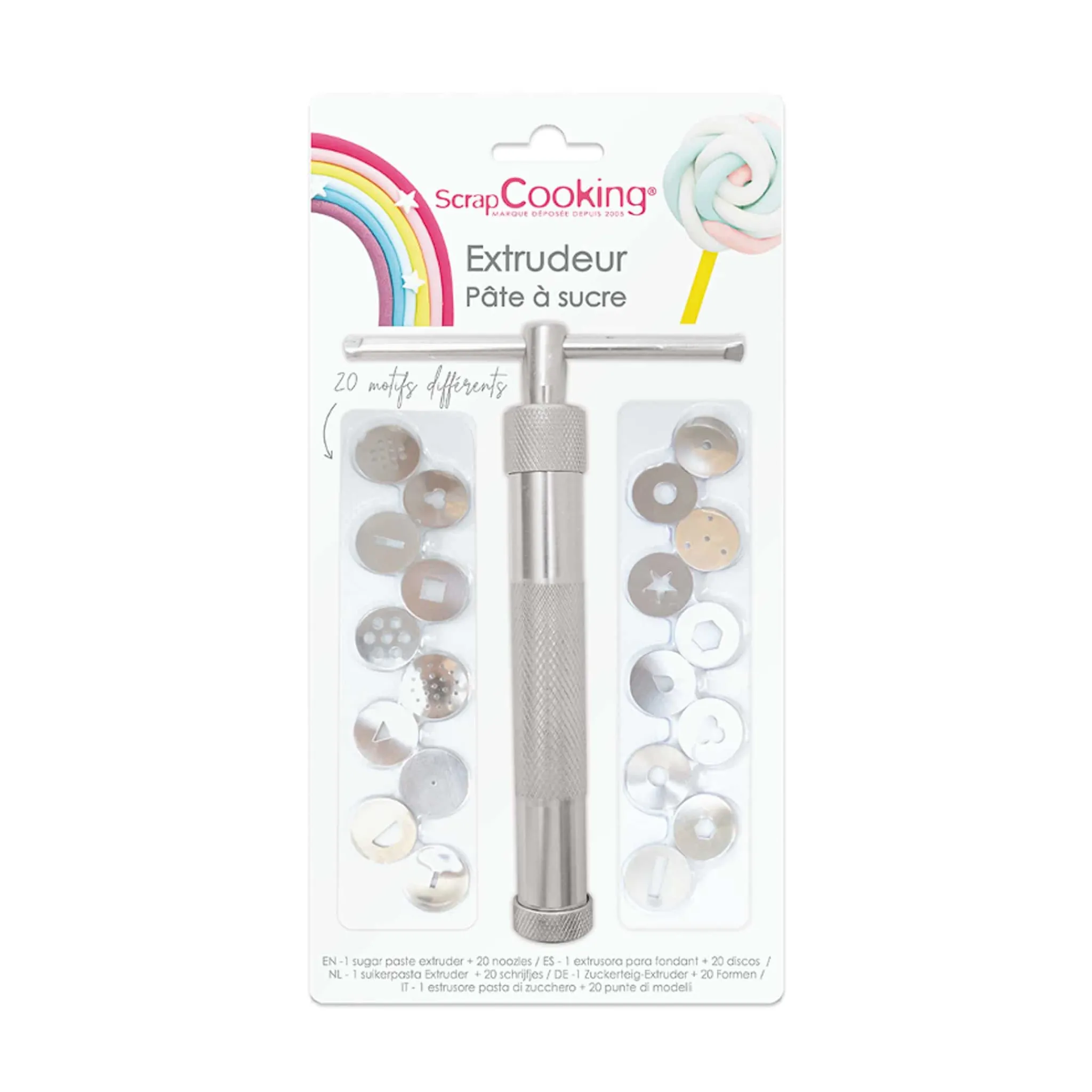 Use this sugarpaste extruder to decorate all kinds of baked goods. There are 20 different discs to create different shapes and designs. It’s a fun and easy way to decorate cakes and cookies with fondant icing and marzipan.