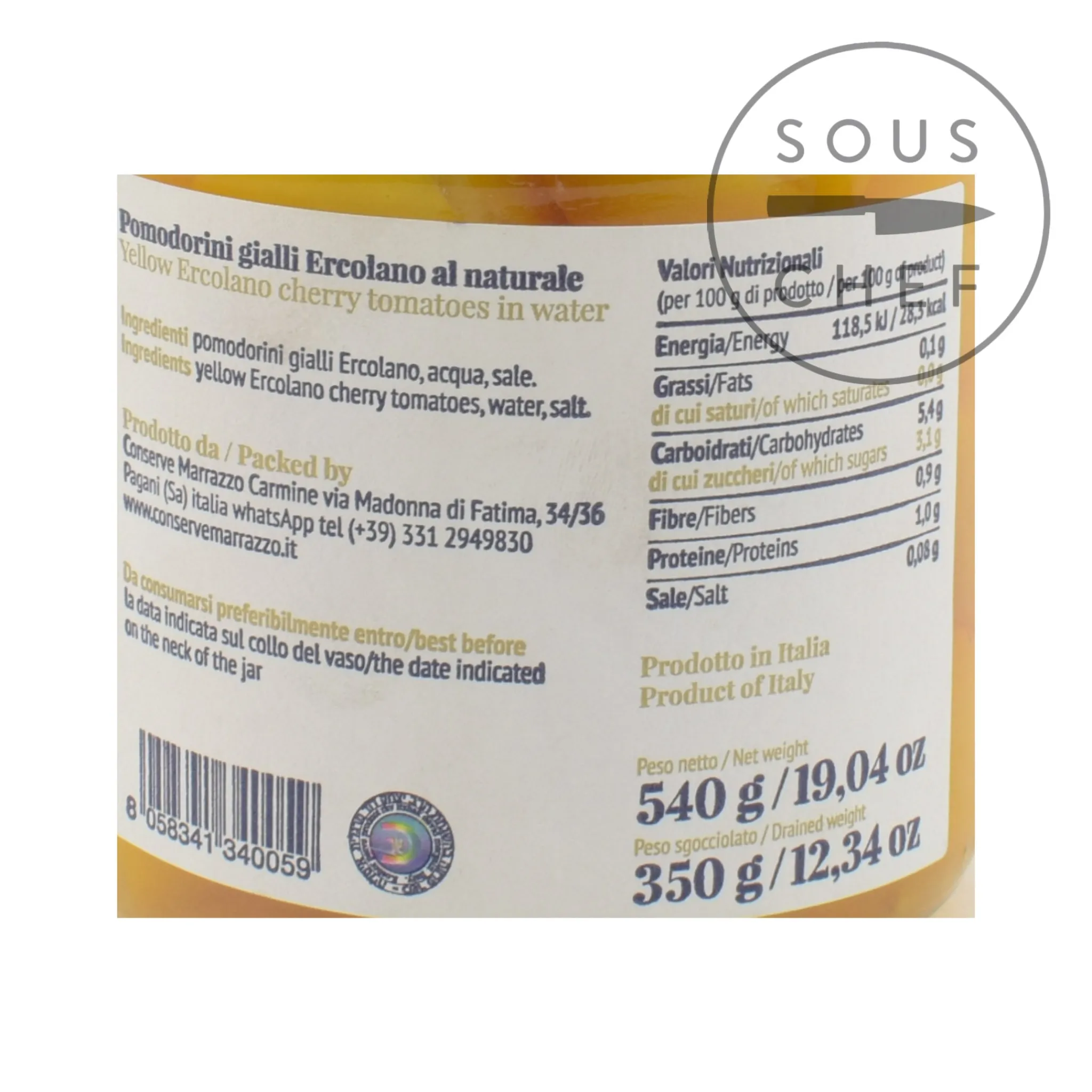 Product formulations and details may change. For the latest ingredients and allergen information always check product packaging prior to consumption. Ingredients: Yellow Ercolano cherry tomatoes, water, salt
