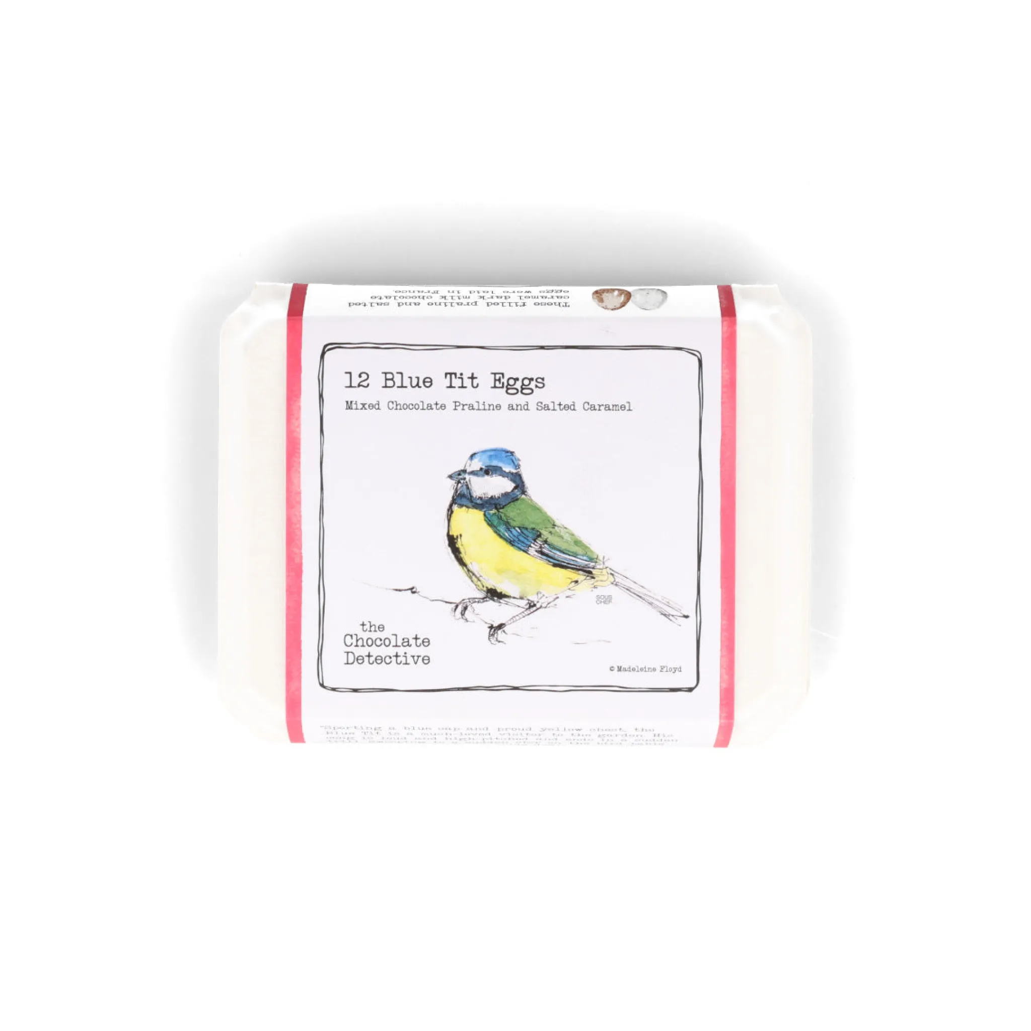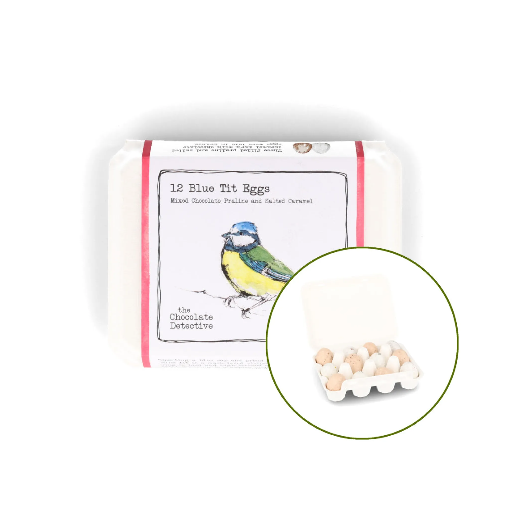 Chocolate Detective’s Blue tit chocolate eggs have realistic speckled shells. Open the box to reveal 12 eggs with white and brown shells. The crunchy sugar shells hide a sweet surprise. Inside, you’ll find layers of milk and dark chocolate. Six eggs are filled with smooth salted caramel. The rest are filled with a rich hazelnut praline.