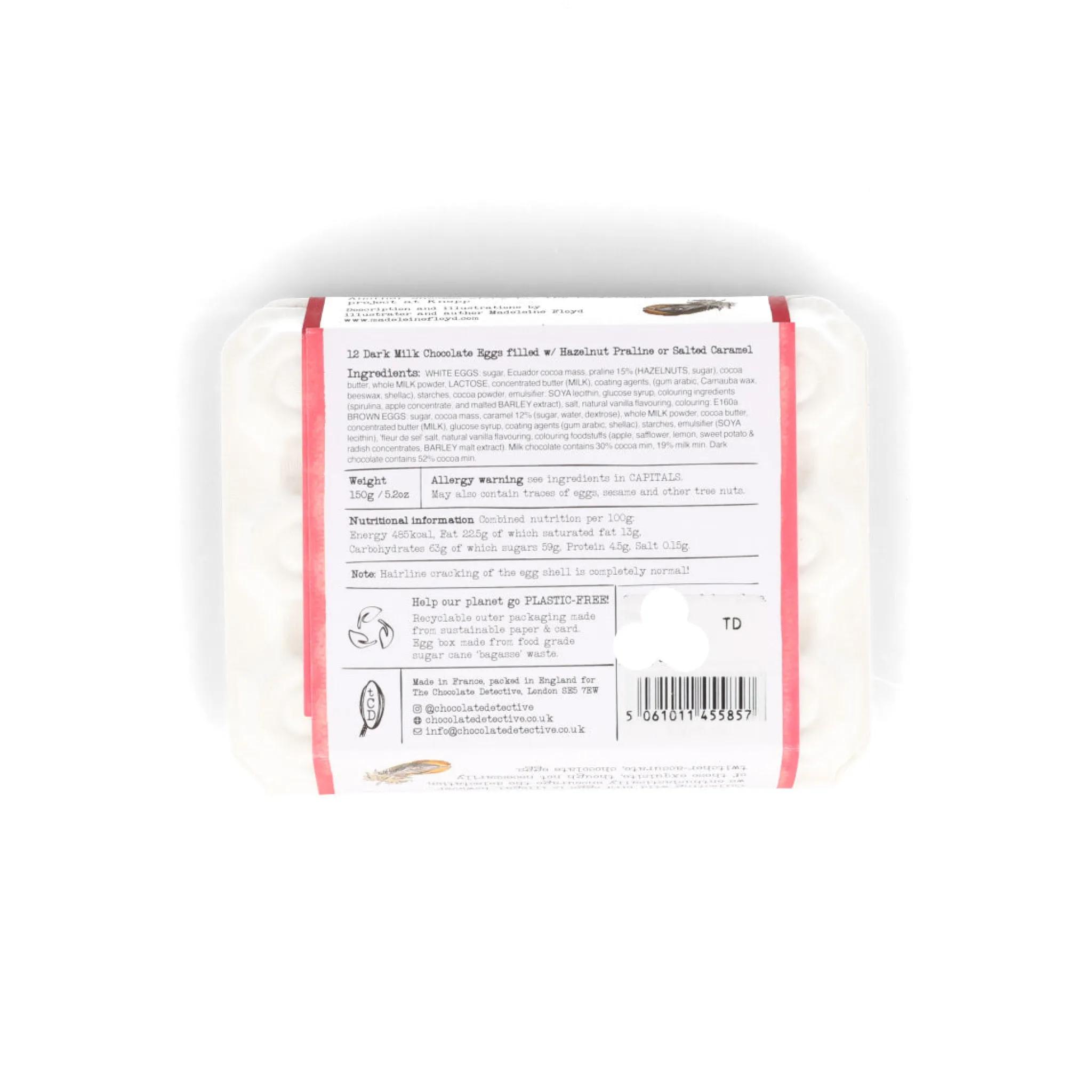 Six eggs are filled with smooth salted caramel. The rest are filled with a rich hazelnut praline.
