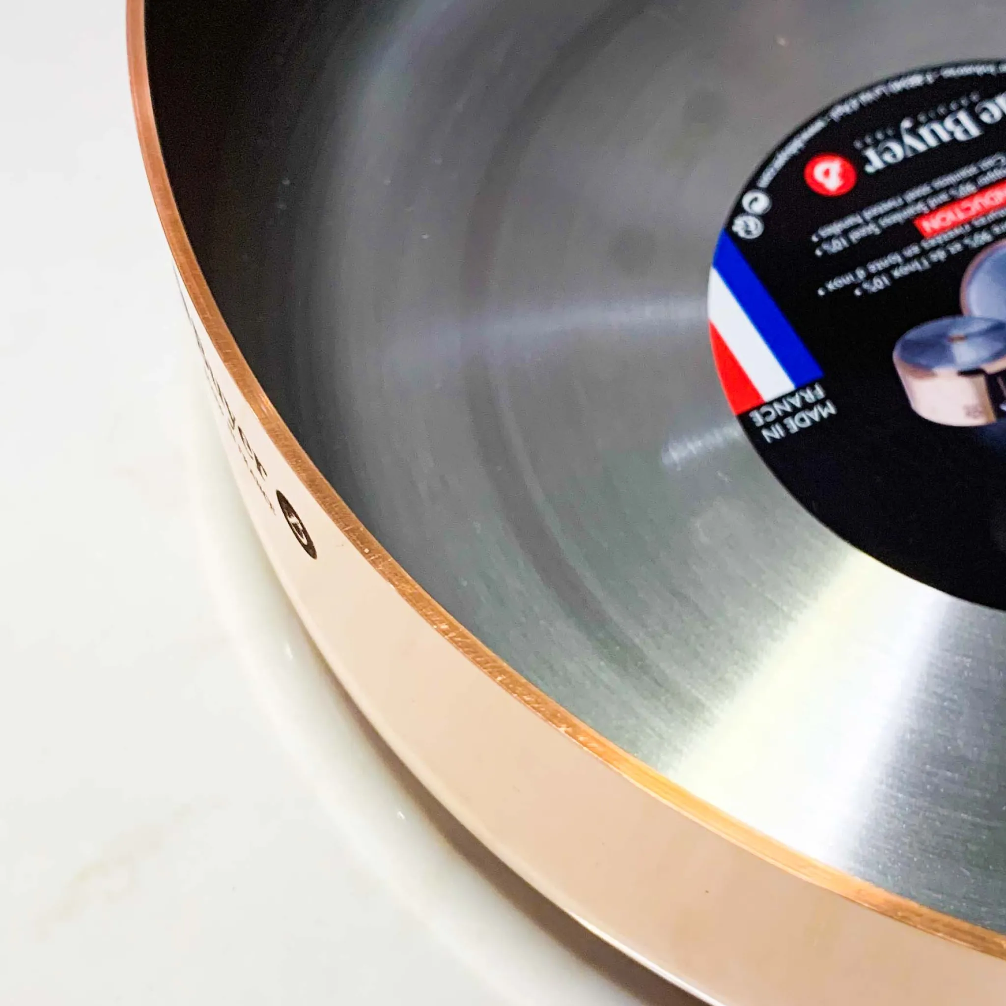 - No more re-tinning! Traditionally copper pans are lined with tin which wears away over time, so you would need to send your pan away to be ‘re-tinned’. Instead, De Buyer use a very thin coating of stainless steel which is durable, will last, and is easy to clean.