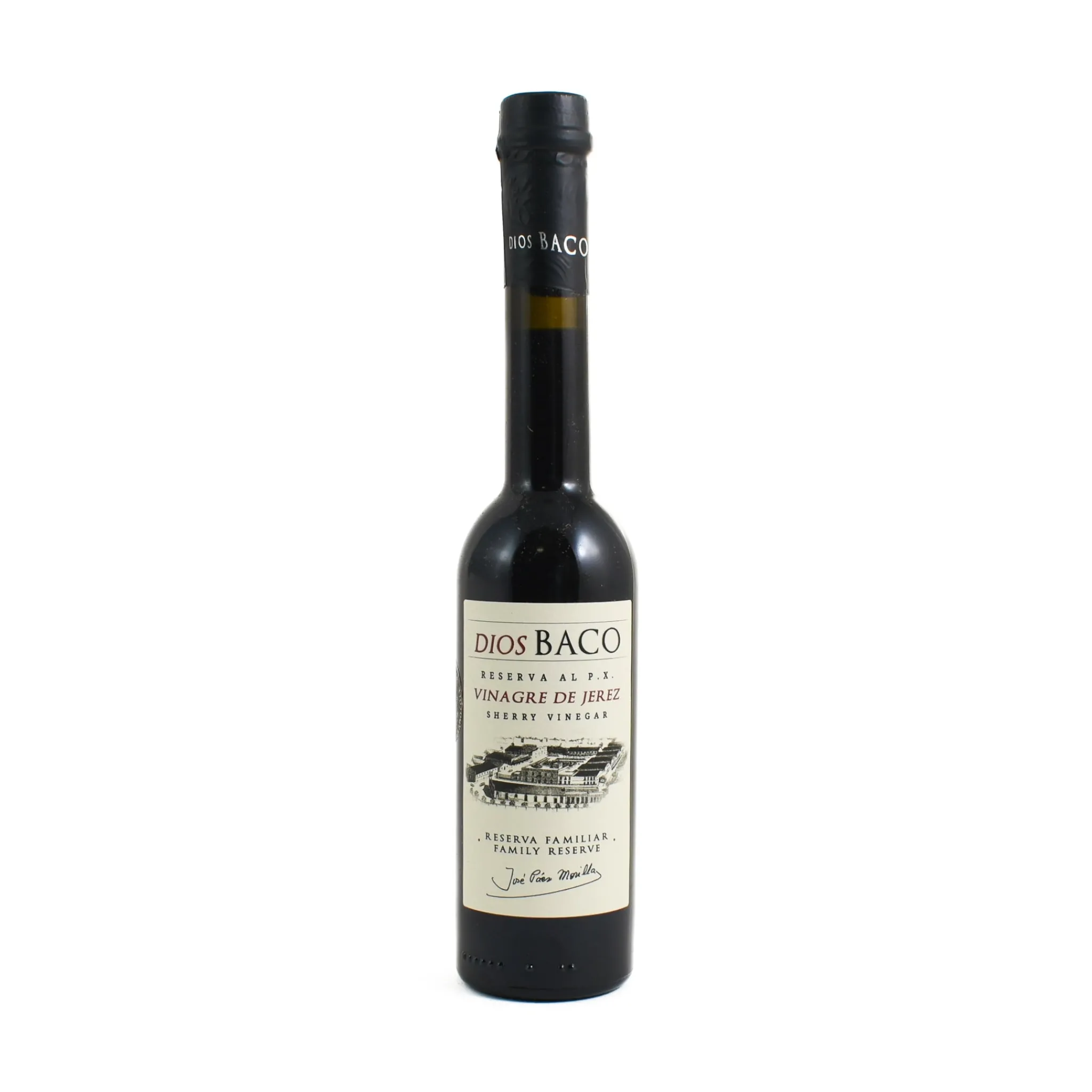 Dios Baco sherry vinegar with Pedro Ximenez is a sharp sherry vinegar that is balanced with the addition of Pedro Ximenez – an intensely dark and sweet Spanish sherry. The Dios Baco sherry vinegar is aged for around 12 years with the Pedro Ximenez adding richness to the vinegar during this process. Use the Dios Baco sherry vinegar with Pedro Ximenez in a similar way to balsamic vinegar – in salad dressings, as a glaze or over figs and cured ham.