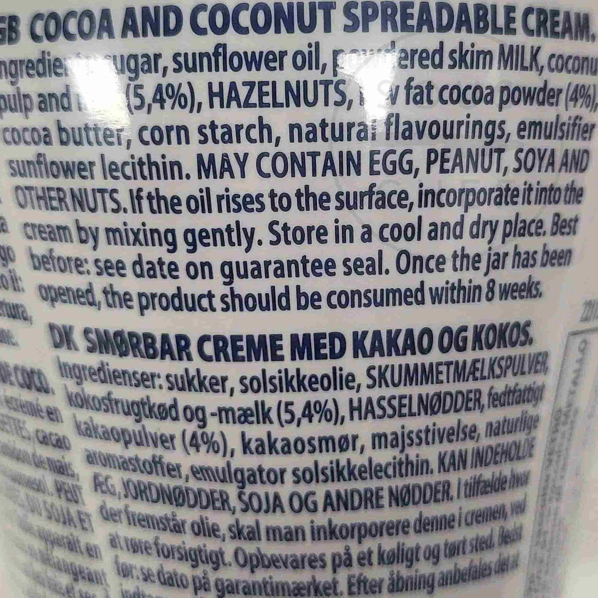 Product formulations and details may change. For the latest ingredients and allergen information always check product packaging prior to consumption. Ingredients: Sugar, sunflower oil, powdered skim milk, coconut pulp and milk (5.4%), hazelnuts, low fat cocoa powder (4%), cocoa butter, corn starch, natural flavourings, emulsifier sunflower lecithin.