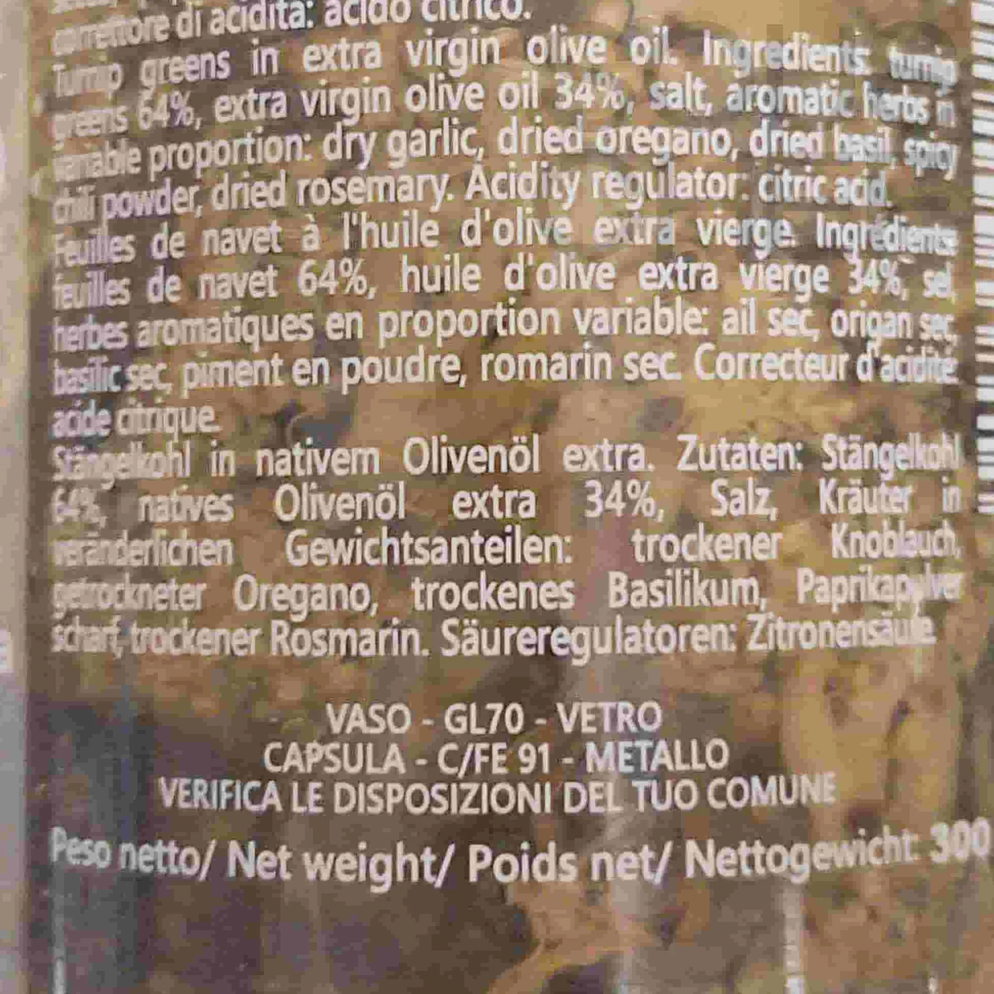 Product formulations and details may change. For the latest ingredients and allergen information always check product packaging prior to consumption. Ingredients: Orecchiette: 100% Italian durum wheat semolina, water; cime: turnip greens 64%, extra virgin olive oil 34%, salt, aromatic herbs in variable proportion: dry garlic, dried oregano, dried basil, spicy chili powder, dried rosemary. citric acid; chilli oil: extra virgin olive oil 99%, chilli 1%
