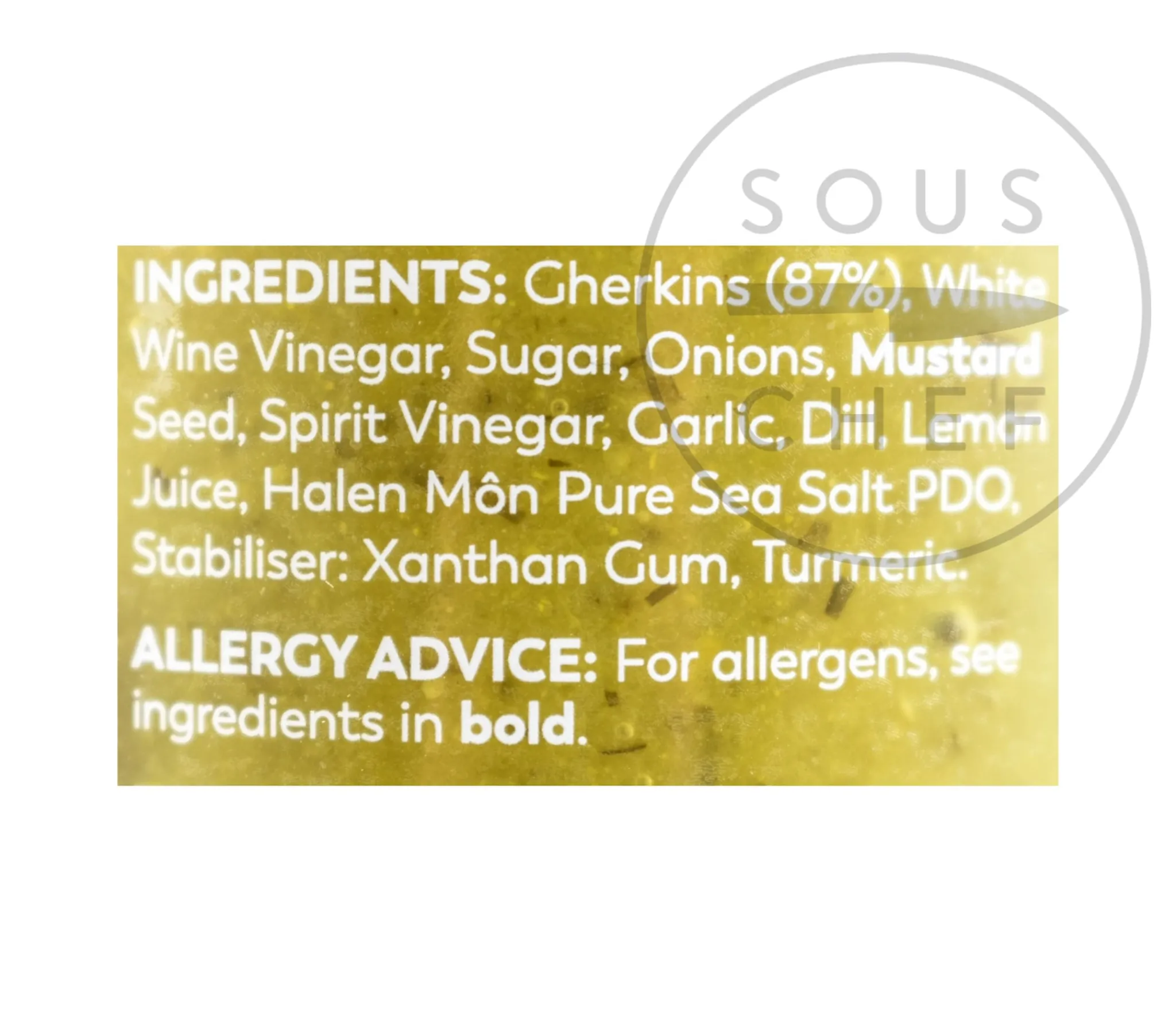 Product formulations and details may change. For the latest ingredients and allergen information always check product packaging prior to consumption. Ingredients: Gherkins (87%), white wine vinegar, sugar, onions, mustard seed, spirit vinegar, garlic, dill, lemon juice, Halen Môn pure sea salt PDO, stabiliser: xanthan gum, turmeric.