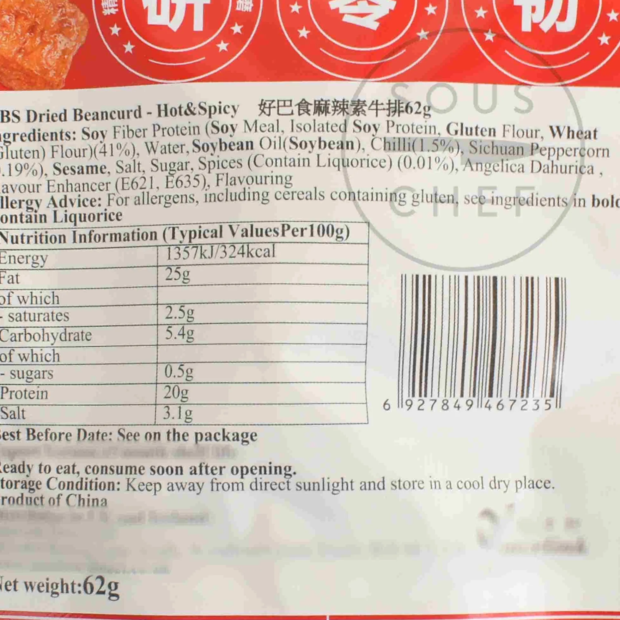 Hot and spicy dried beancurds are a savoury snack from China. Known as ‘vegetarian beefsteak’, they have a meaty flavour and slightly chewy texture.