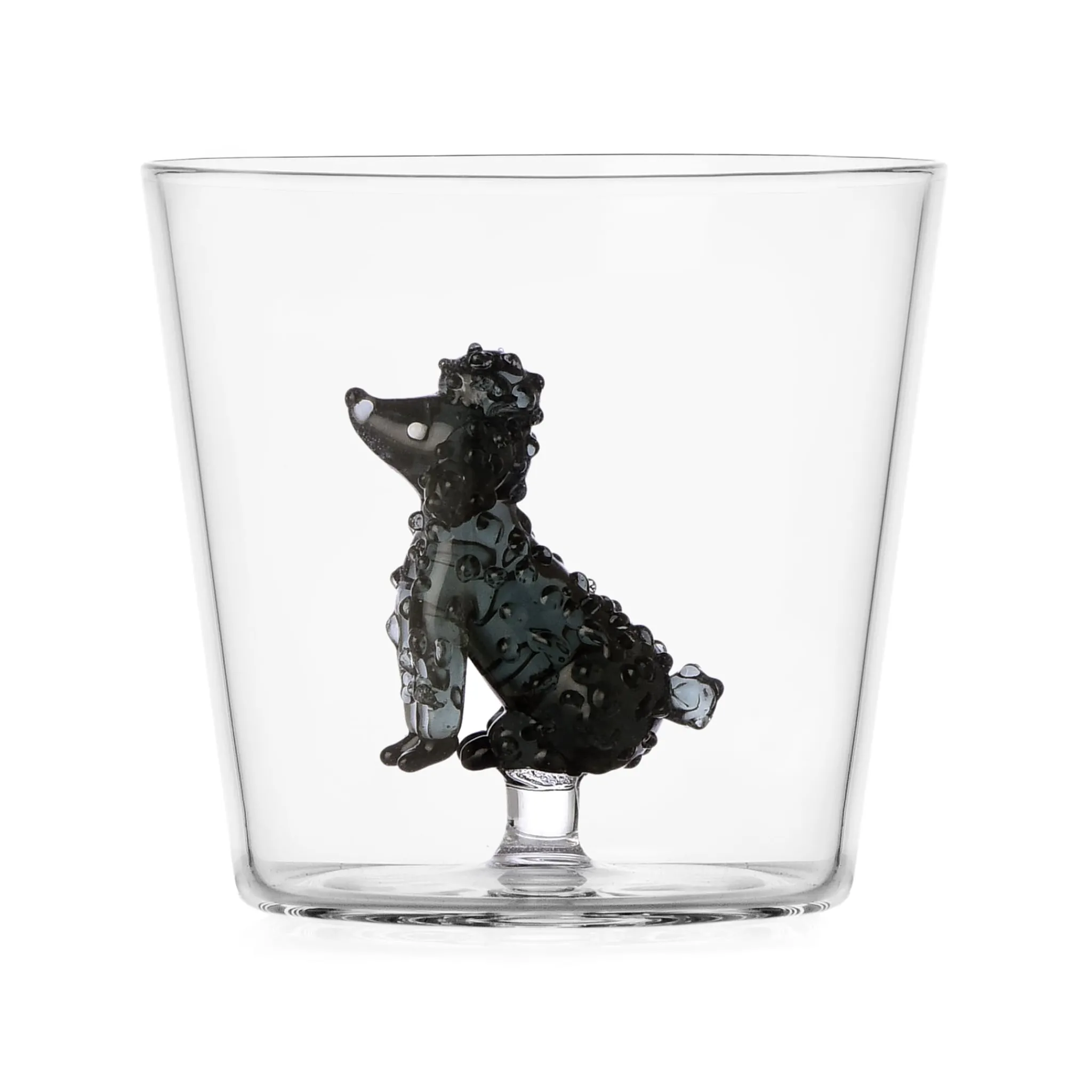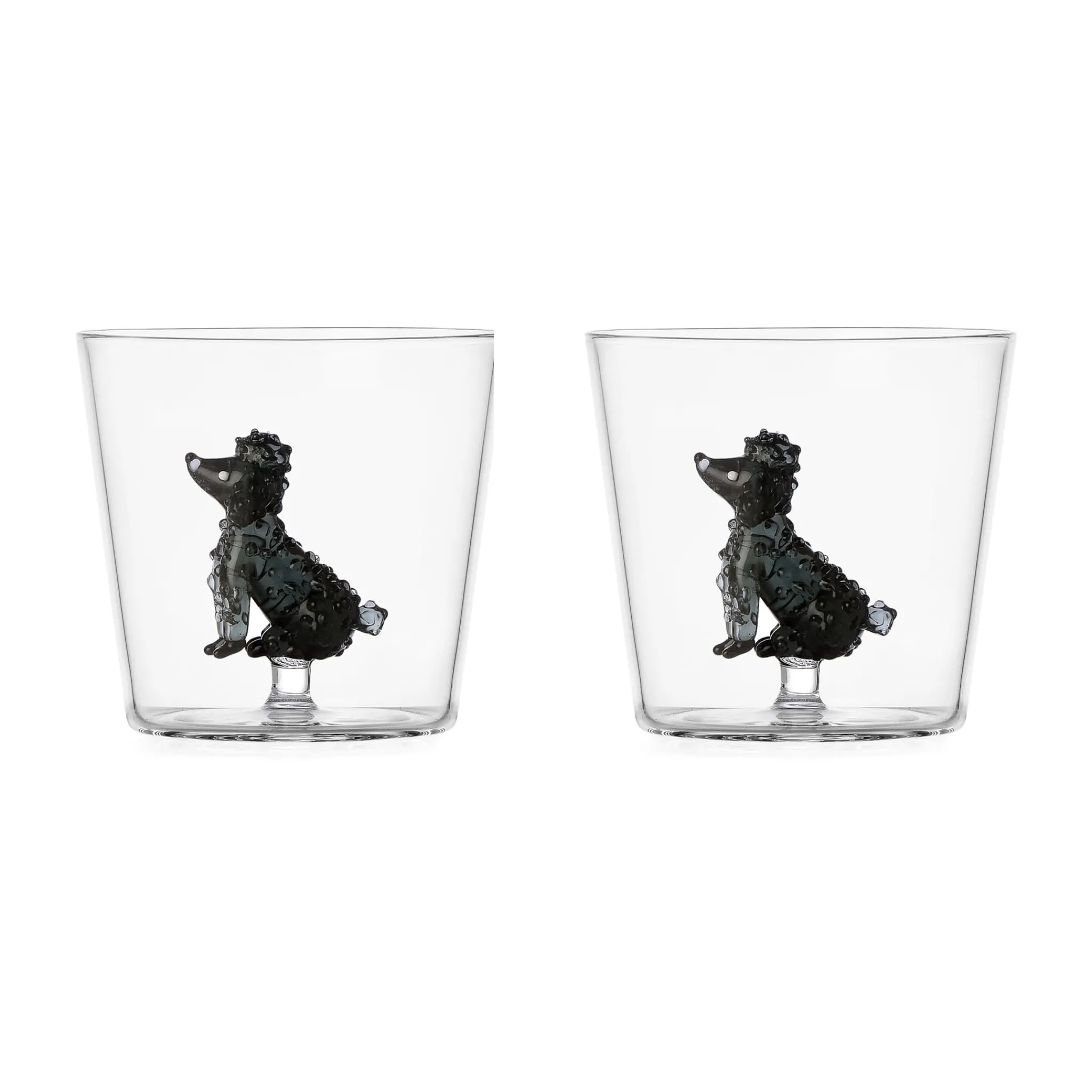 Sip soda and fruit juice from Ichendorf Milano’s poodle tumblers. Made from flame-worked glass, each tumbler has a curly-coated dog inside.