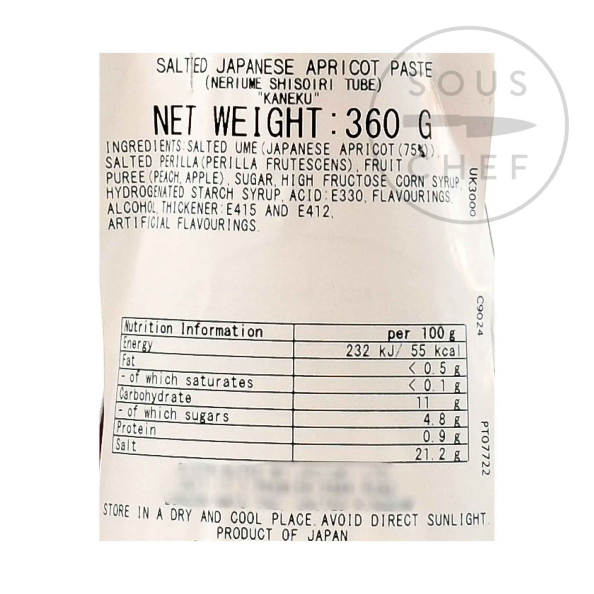 Product formulations and details may change. For the latest ingredients and allergen information always check product packaging prior to consumption. Ingredients: salted ume (Japanese apricot [75%), salted perilla (perilla frutescens), fruit puree (peach, apple,) sugar, high fructose corn syrup, hydrogenated starch syrup, acid: E330, flavourings, alcohol, thickeners: E415, E412, artificial flavourings.