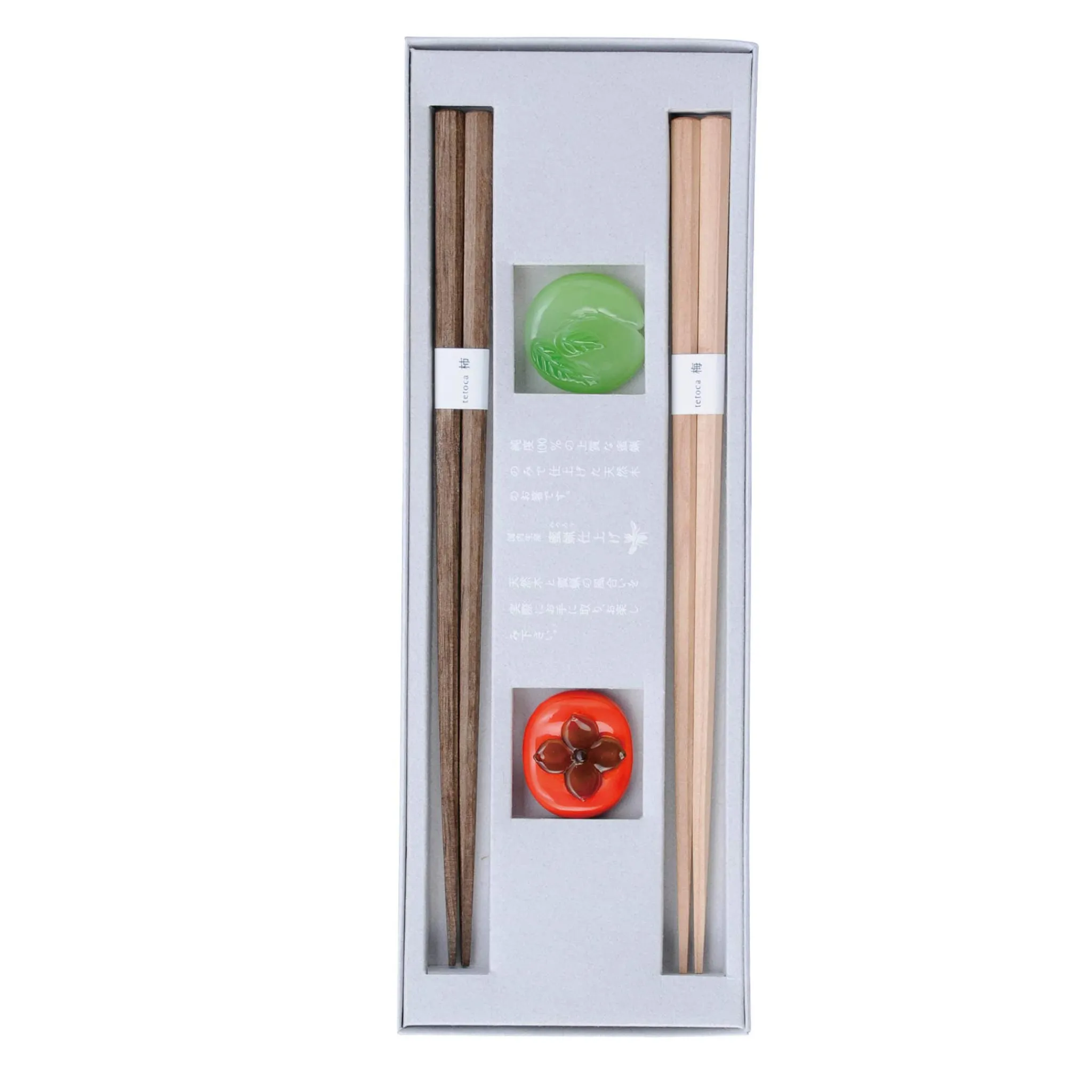 The chopsticks are coated with pure beeswax instead of traditional paint or lacquer. This smooth, natural finish is eco-friendly and gentle on the skin. The set includes colourful glass chopstick rests which are handmade by craftsmen in Vietnam. In a nod to the fruitwood used to make the chopsticks, the rests are designed to look like a little orange persimmon and a pale green plum. Place your chopsticks on the rests at mealtimes to protect your table.