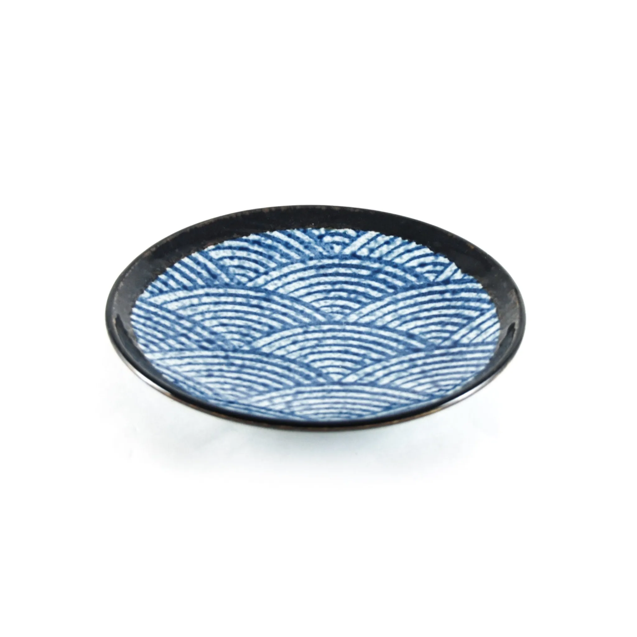 The round side plate is decorated with a textured white and blue glaze in a stylised wave pattern. The plate is finished with a glossy brown-black border.
