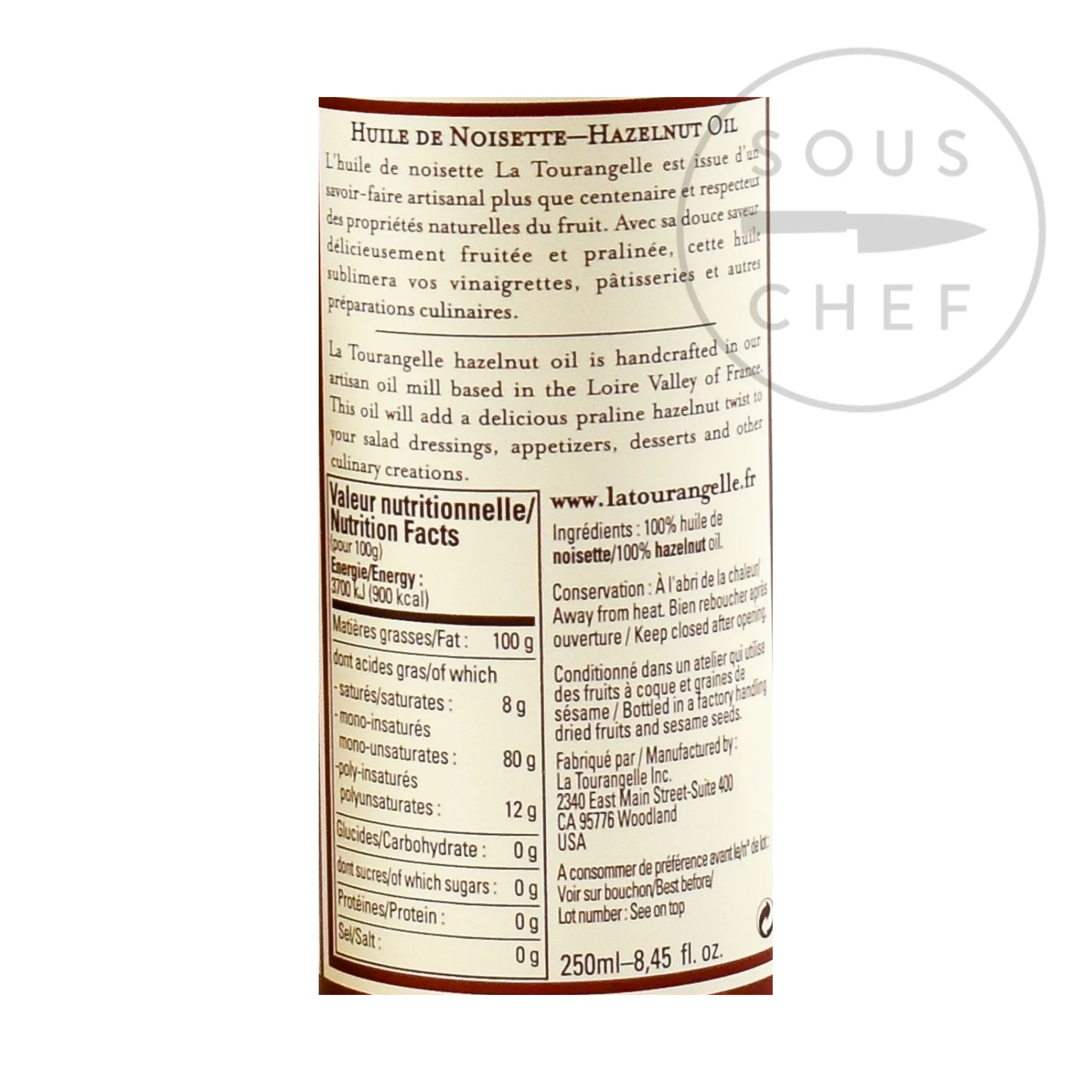 La Tourangelle hazelnut oil is hand crafted in the Tourangelle artisan oil mill based in the Loire Valley in France. The pure hazelnut oil is made from roasted, ground, and pressed hazelnuts. The richly-flavoured nut oil is a great way to bring French country chic or a fine-dining finish to dishes. Hazelnut oil works well alongside big flavours like goats’ cheese and red meat, and used sparingly, is a great vinaigrette-base for green vegetables and salads.