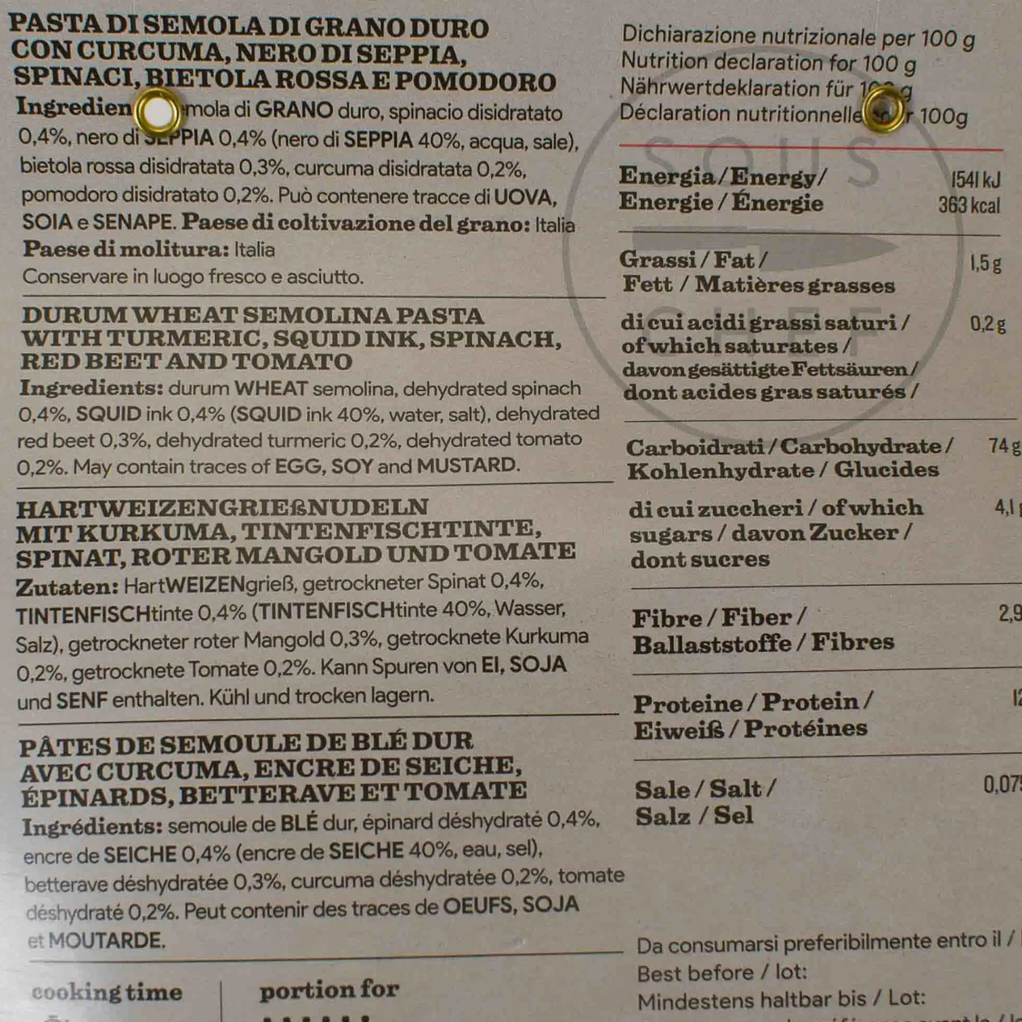Product formulations and details may change. For the latest ingredients and allergen information always check product packaging prior to consumption. Ingredients: durum WHEAT semolina, dehydrated spinach 0,4%, SQUID ink 0,4% (SQUID ink 40%, water, salt), dehydrated red beet 0,3%, dehydrated turmeric 0,2%, dehydrated tomato 0,2%.