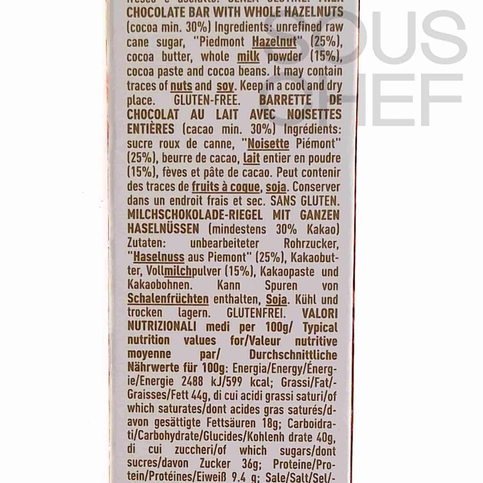 Product formulations and details may change. For the latest ingredients and allergen information always check product packaging prior to consumption. Ingredients: Unrefined raw cane sugar, “piedmont hazelnut” (25%), cocoa butter, whole milk powder (15%), cocoa paste and cocoa beans
