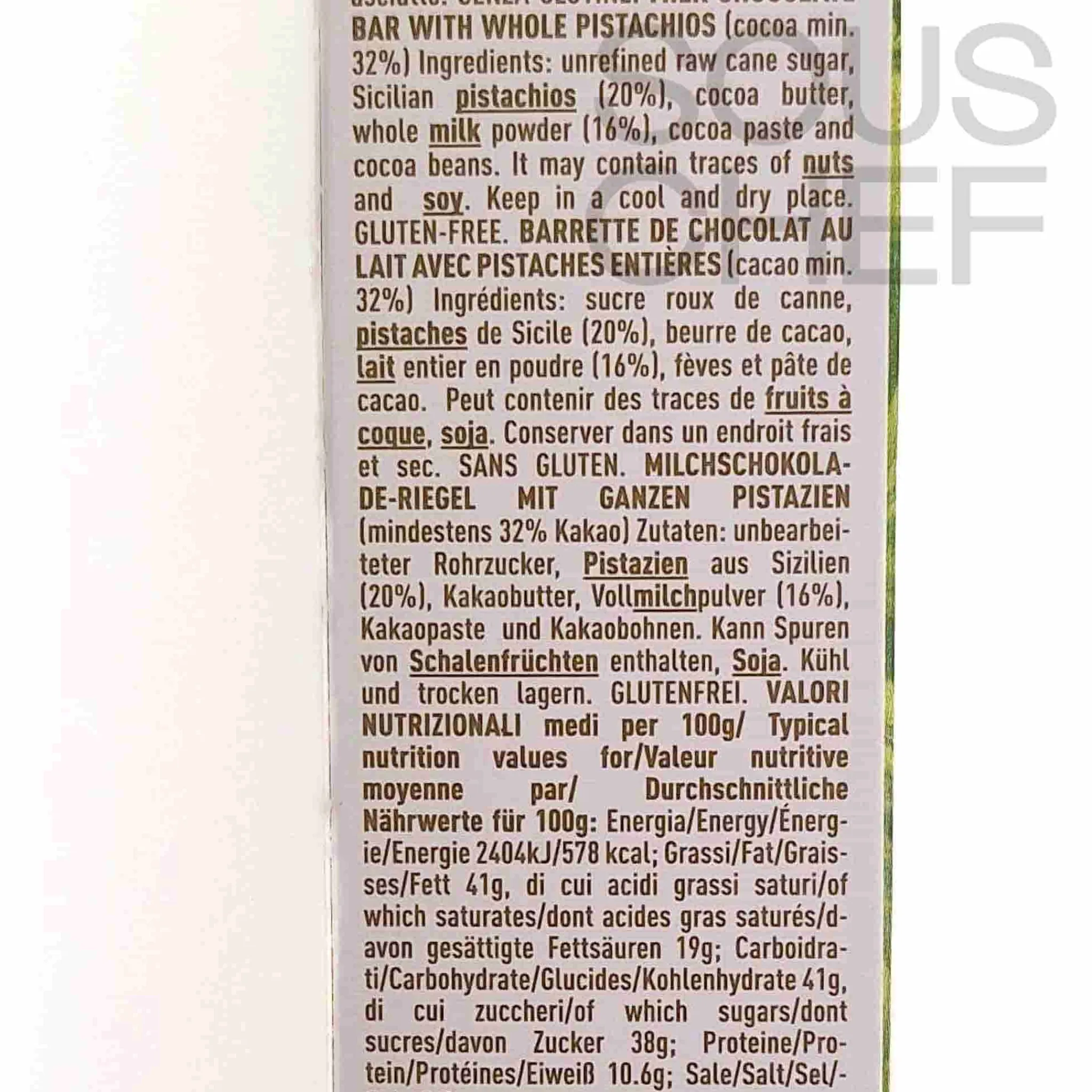 Product formulations and details may change. For the latest ingredients and allergen information always check product packaging prior to consumption. Ingredients: unrefined raw cane sugar, sicilian pistachios (20%), cocoa butter, whole milk powder (16%), cocoa paste and cocoa beans.
