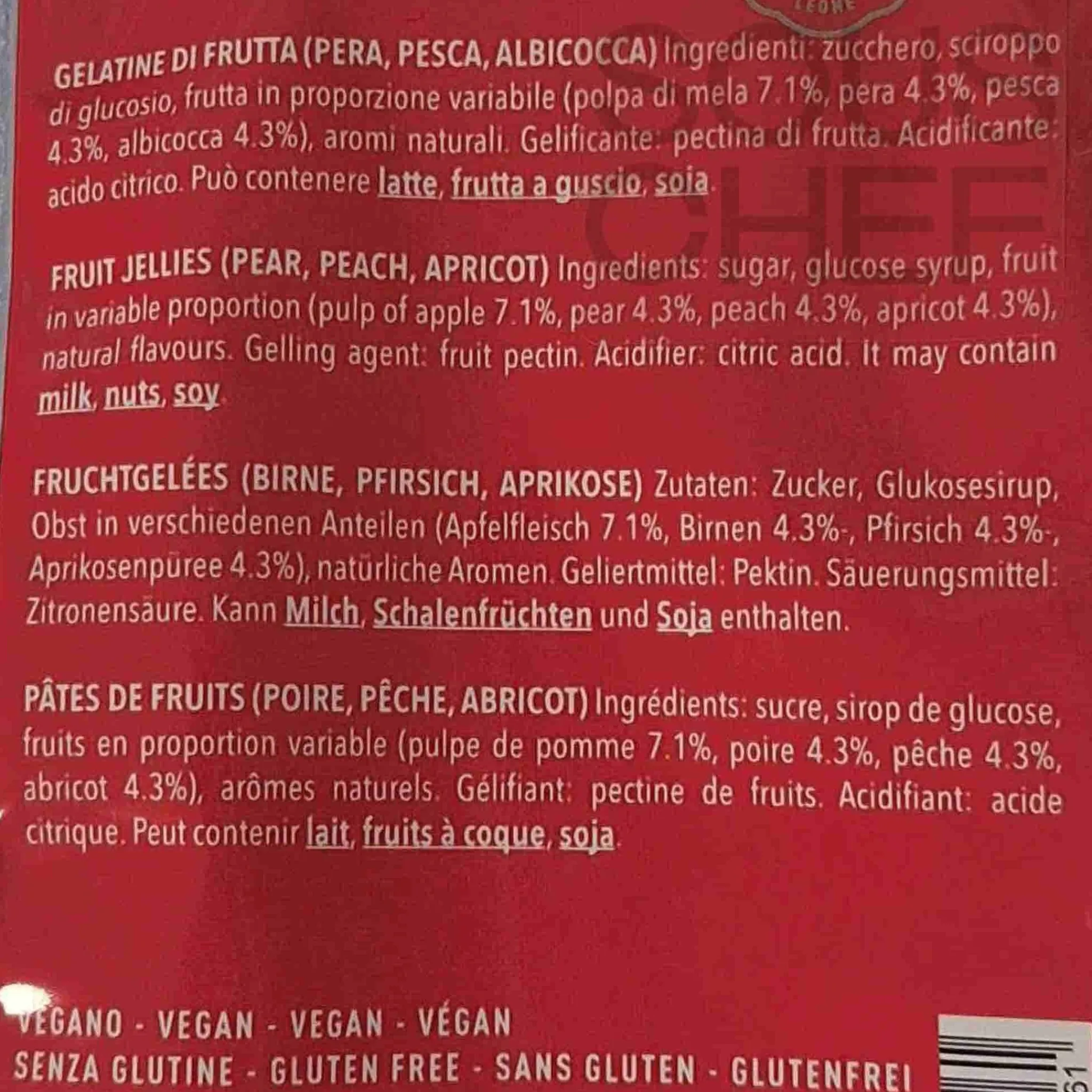Product formulations and details may change. For the latest ingredients and allergen information always check product packaging prior to consumption. Ingredients: Sugar, glucose syrup, fruit in variable proportion (pulp of apple 7.1%, pear 4.3%, peach 4.3%, apricot 4.3%), natural flavours. Gelling agent:fruit pectin. Acidifier: citric acid.
