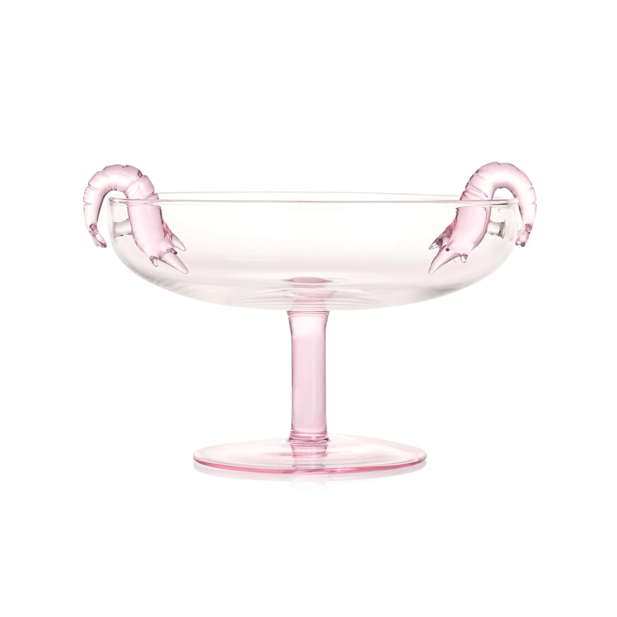This prawn cocktail platter is perfect for retro appetisers. It features a clear glass bowl and a pale pink stem. Delicate glass prawns are perched on either side of the platter.