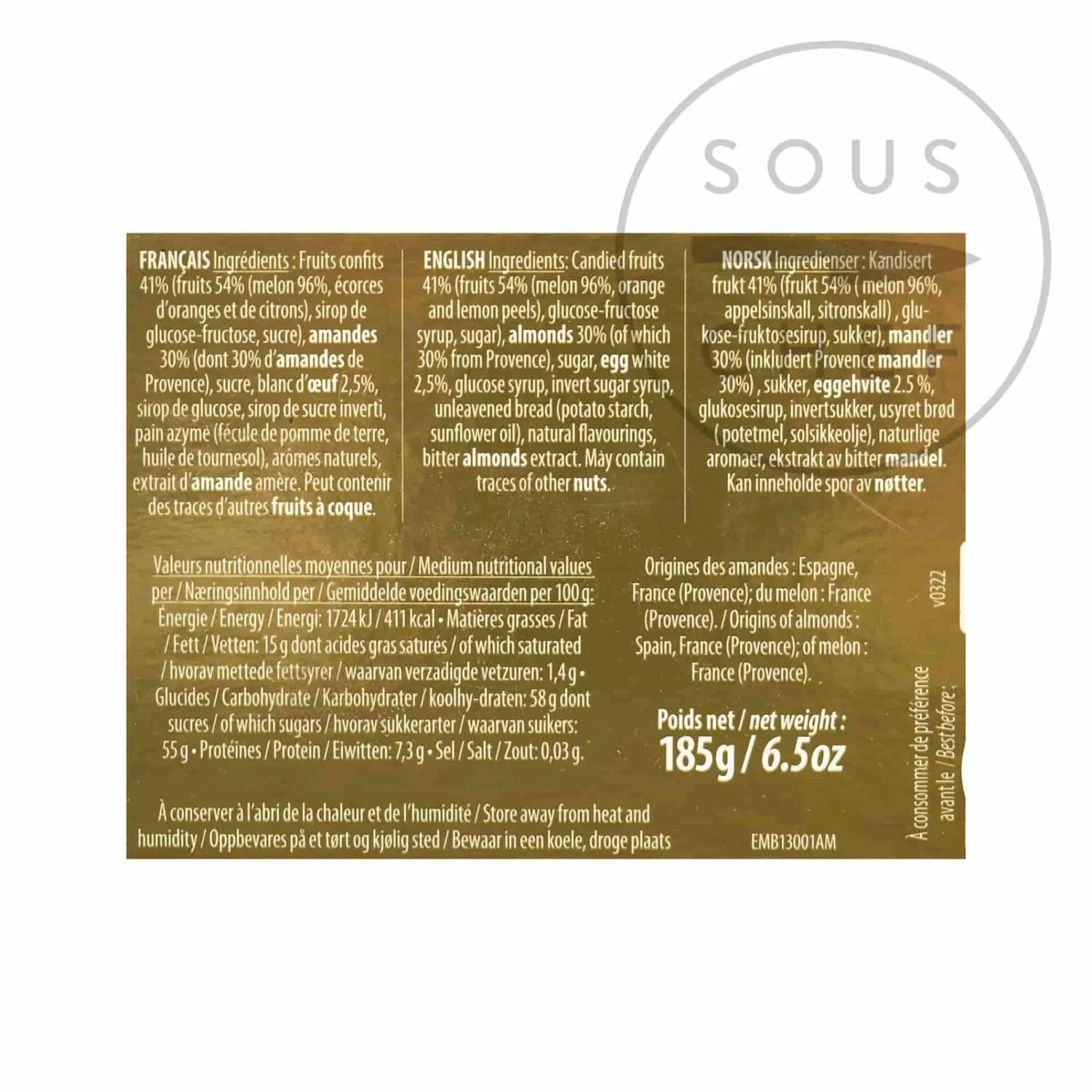 Product formulations and details may change. For the latest ingredients and allergen information always check product packaging prior to consumption. Ingredients: candied fruits 41% (fruits 54% [melon 96%, orange and lemon peels], glucose-fructose syrup, sugar), almonds 30% (of which 30% from Provence), sugar, egg white 2,5%, glucose syrup, invert sugar syrup, unleavened bread (potato starch, sunflower oil), natural flavourings, bitter almonds extract.