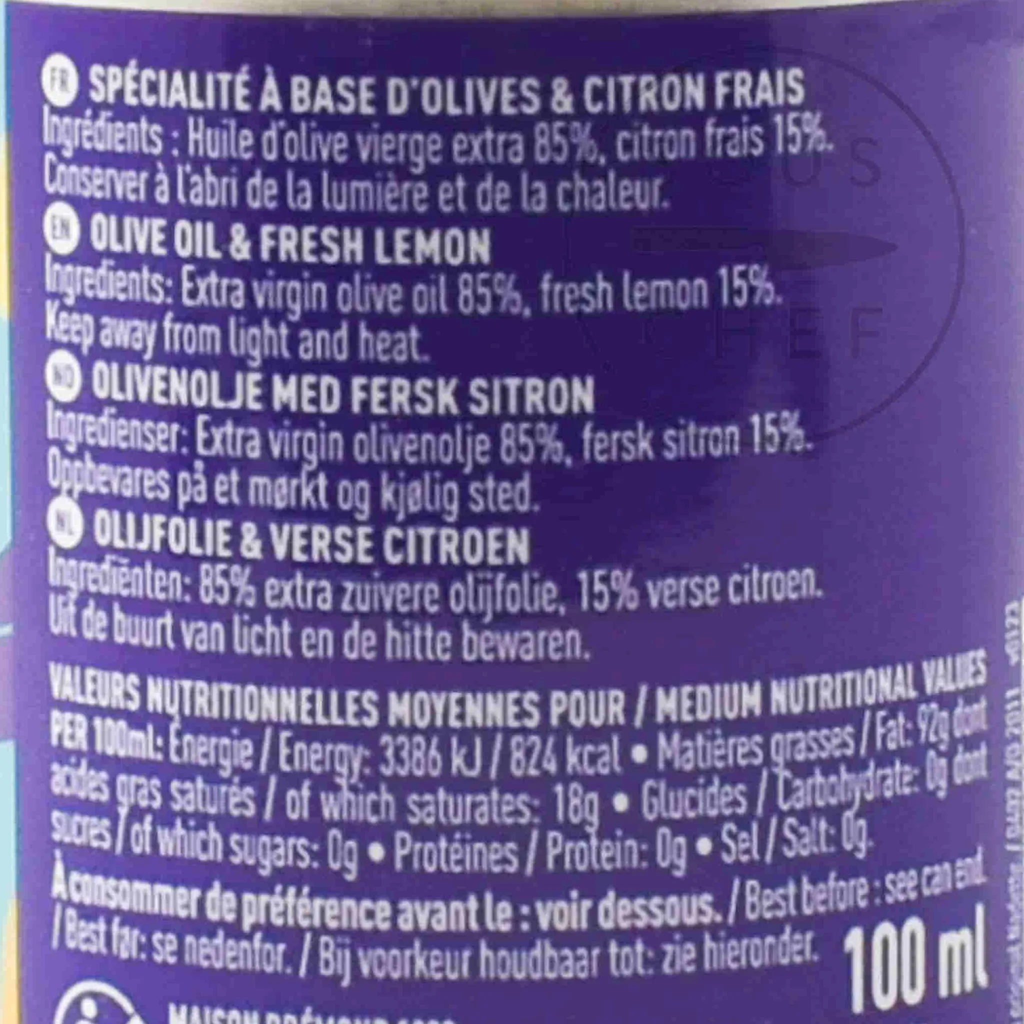 Product formulations and details may change. For the latest ingredients and allergen information always check product packaging prior to consumption. Ingredients: Extra virgin olive oil 85%, fresh lemon 15%.