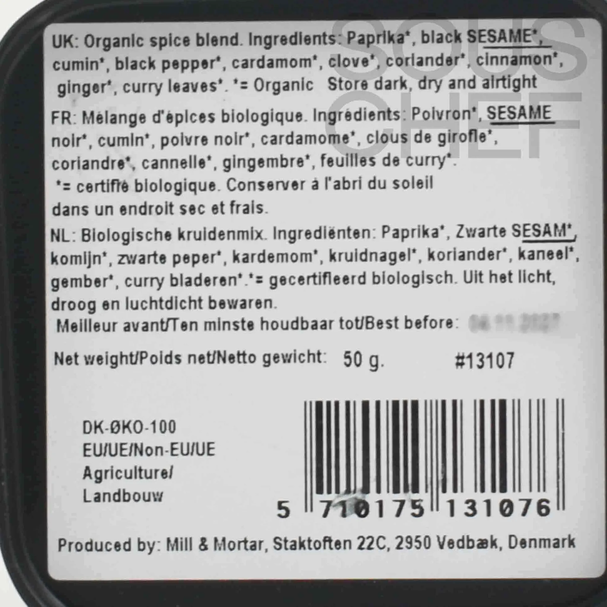 Product formulations and details may change. For the latest ingredients and allergen information always check product packaging prior to consumption. Ingredients: Black sesame *, paprika *, cumin, * black pepper *, cardamom *, cloves *, coriander *, cinnamon *, ginger *, curry leaves *. * = organic