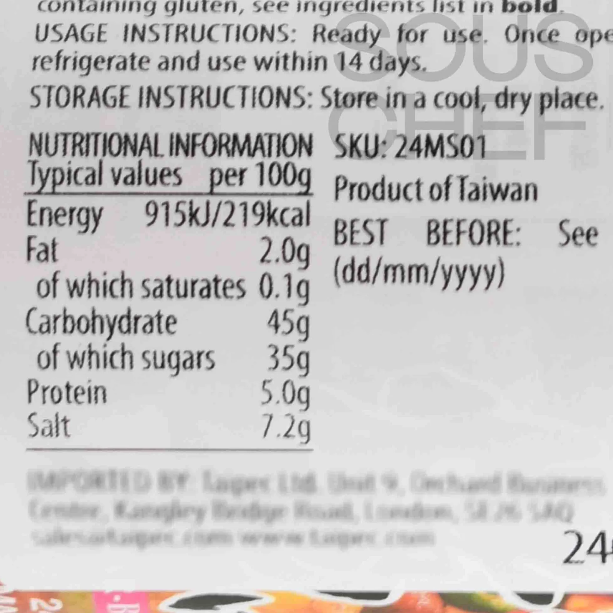 Product formulations and details may change. For the latest ingredients and allergen information always check product packaging prior to consumption. Ingredients: Soy sauce (46%) (soybean, wheat, water, salt, sugar), water, sugar, tomato, chilli, vinegar, garlic, thickener (e1412), pepper.