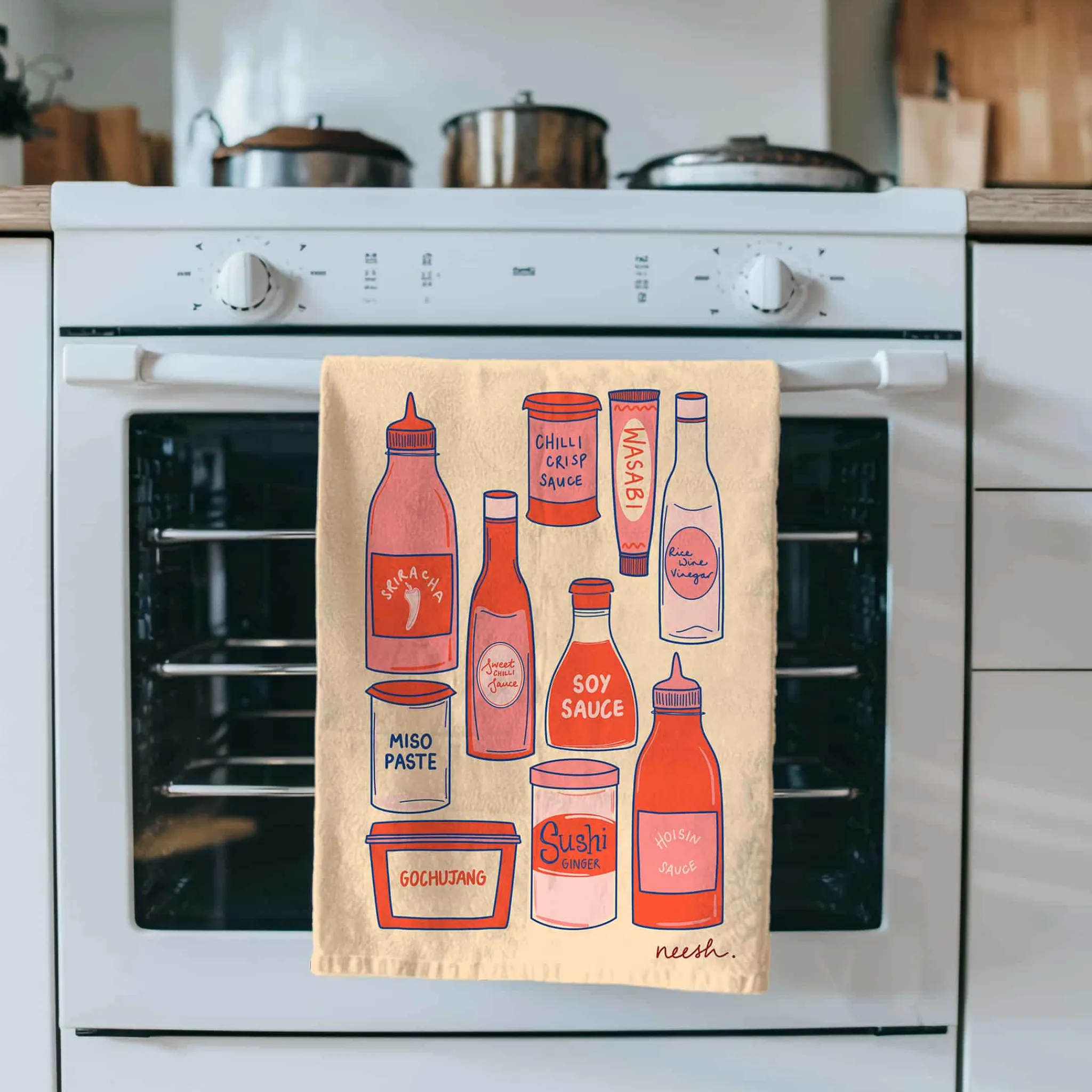 This saucy tea towel will delight Asian food lovers. The hand-drawn design showcases popular condiments in shades of pink and red. It’s a great way to add a splash of colour to your home.