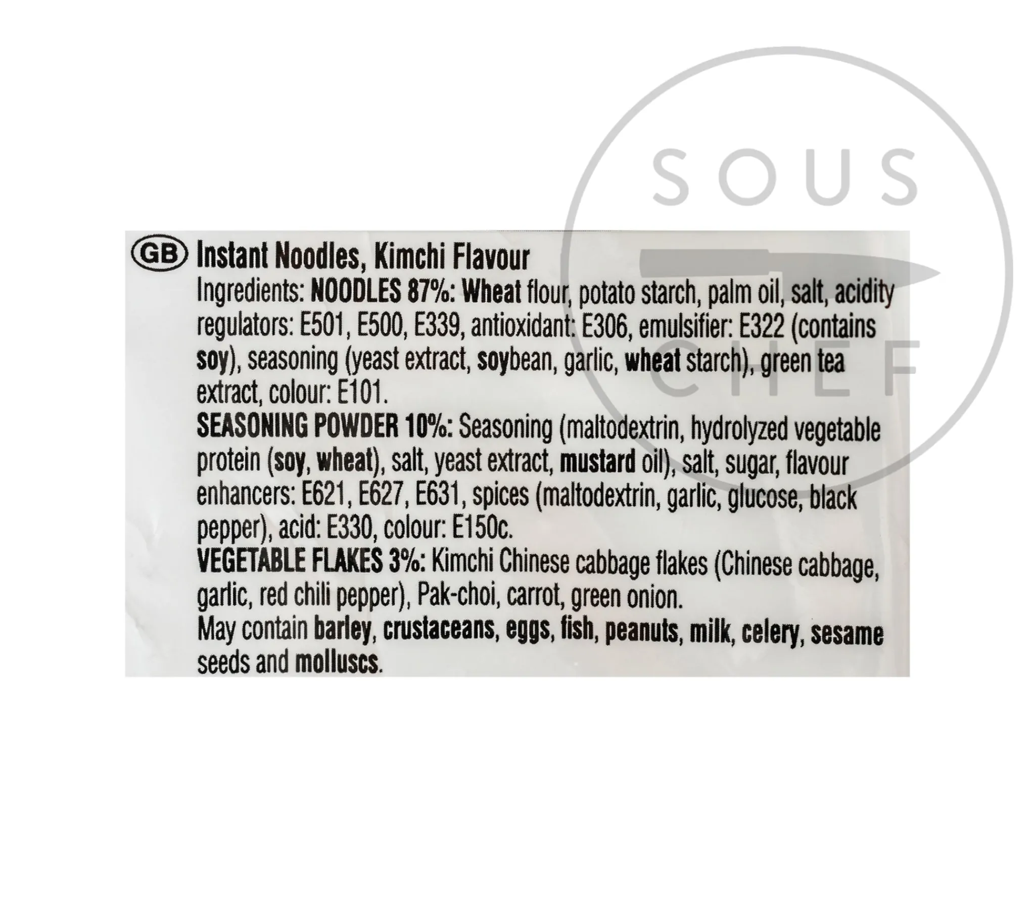 Product formulations and details may change. For the latest ingredients and allergen information always check product packaging prior to consumption. Ingredients: Noodles 87%: Wheat flour, potato starch, palm oil, salt, acidity regulator: E501, E500, E339, antioxidant E306, emulsifier: E322 (contains soy), seasoning (yeast extract, soybean, garlic, wheat starch), green tea extract, colour E101. Seasoning powder 10%: Seasoning (maltodextrin, hydrolyzed vegetable protein (soy, wheat), salt, yeast extract, mustard oil), salt, sugar, flavour enhancers: E621, E627, E631, spices (maltodextrin, garlic, glucose, black pepper), acid: E330, colour: E150c. Vegetable flakes 3%: kimchi Chinese cabbage flakes (Chinese cabbage, garlic, red chilli pepper), Pak-choi, carrot, green onion.