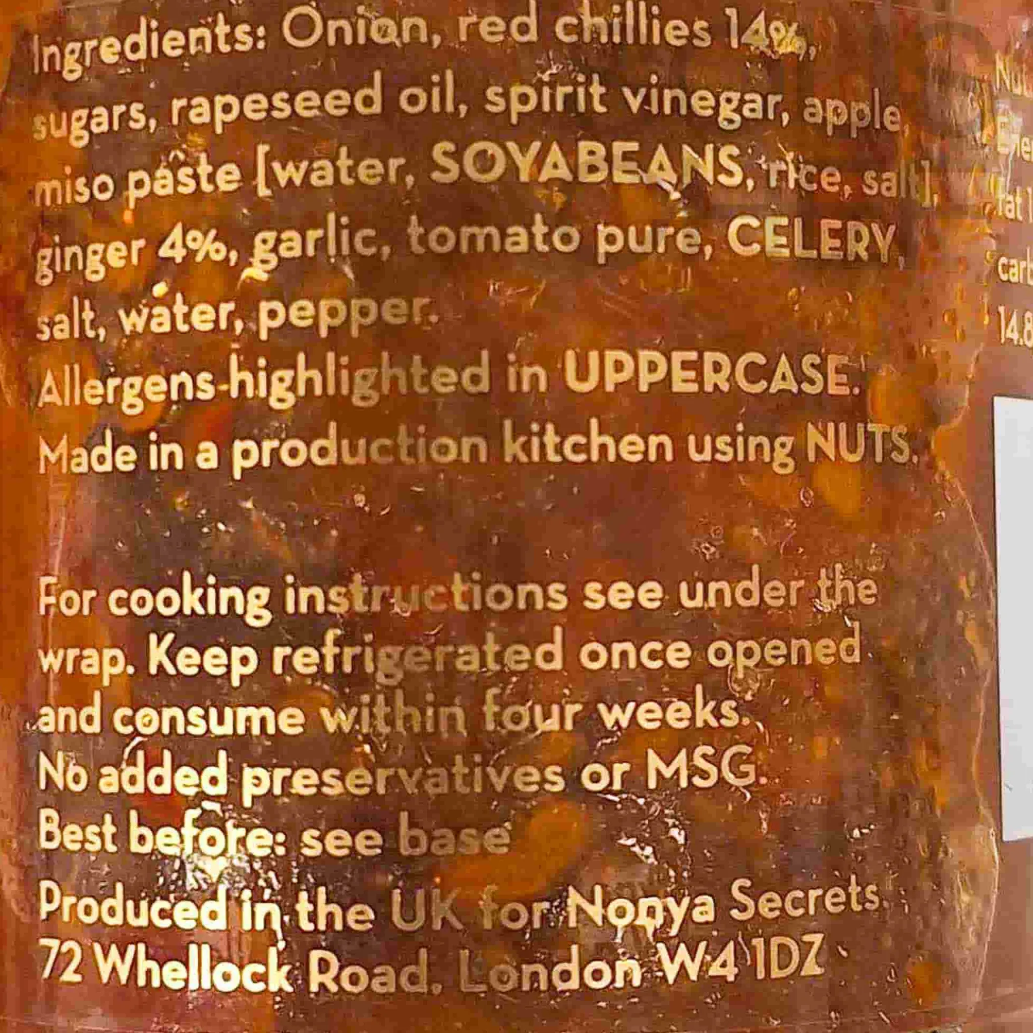 Product formulations and details may change. For the latest ingredients and allergen information always check product packaging prior to consumption. Ingredients: Onions, chillies. sugar, rapeseed oil, spirit vinegar, apple, miso paste (water, soybean, (rice, salt, alcohol), ginger, garlic, tomato, celery, salt, water, pepper.