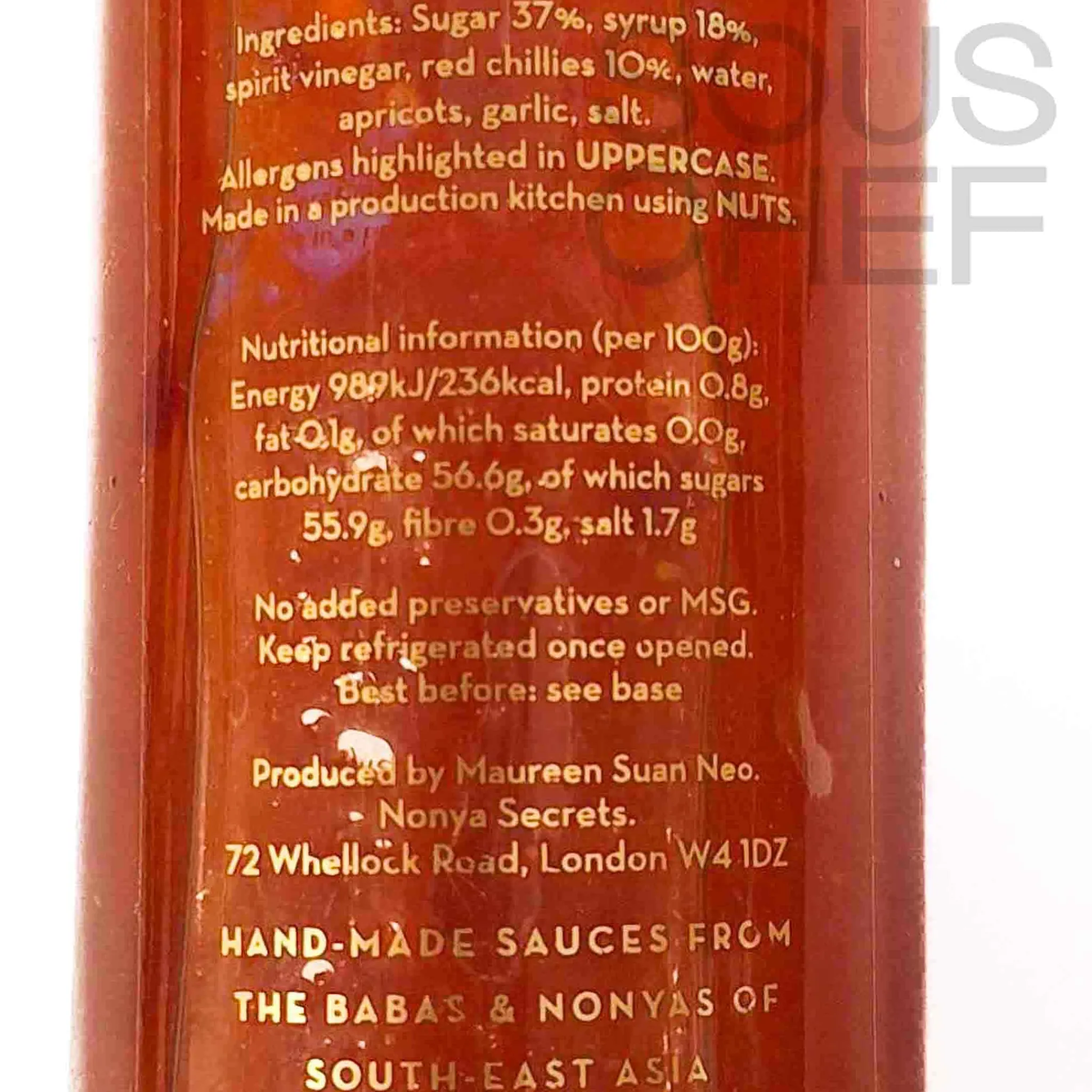 Product formulations and details may change. For the latest ingredients and allergen information always check product packaging prior to consumption. Ingredients: Sugar 37%, syrup 18%, spirit vinegar, red chillies 10%, water, apricots, garlic, salt.