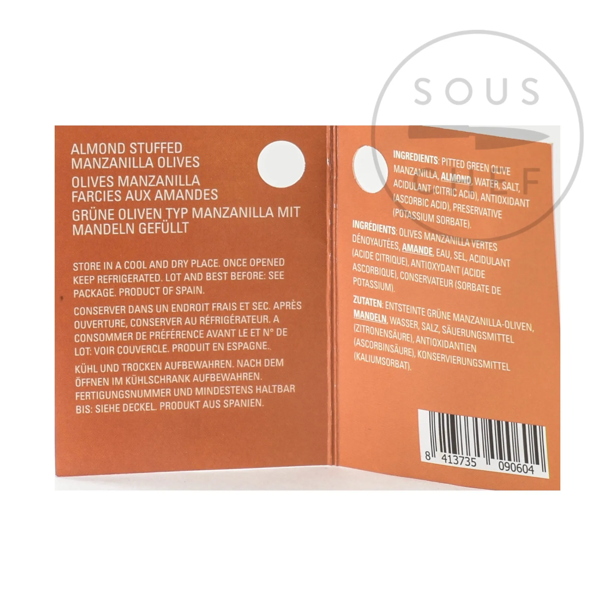 Product formulations and details may change. For the latest ingredients and allergen information always check product packaging prior to consumption. Ingredients: Pitted green olive manzanilla (31%), almond (20%), salt, acidulant (E330),preservative (E202), flavour enhancer (E621), antioxidant (E300).