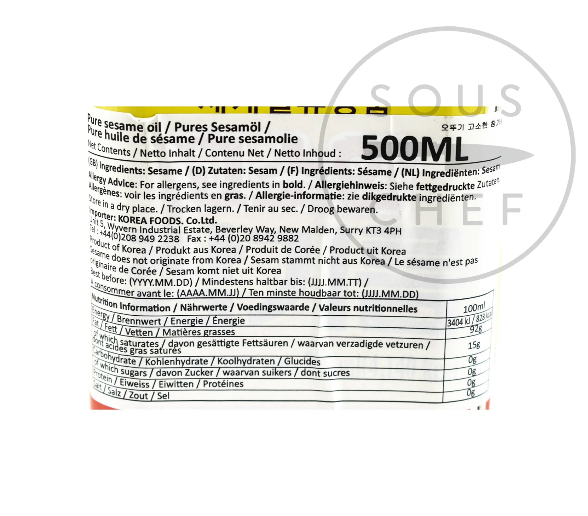Pure Korean sesame oil adds a nutty aroma and deep toasted flavour to classic Korean dishes, from bibimbap to bulgogi. This amber-coloured oil is made entirely from sesame seeds with an intense, nutty, buttery flavour – a great finishing oil.