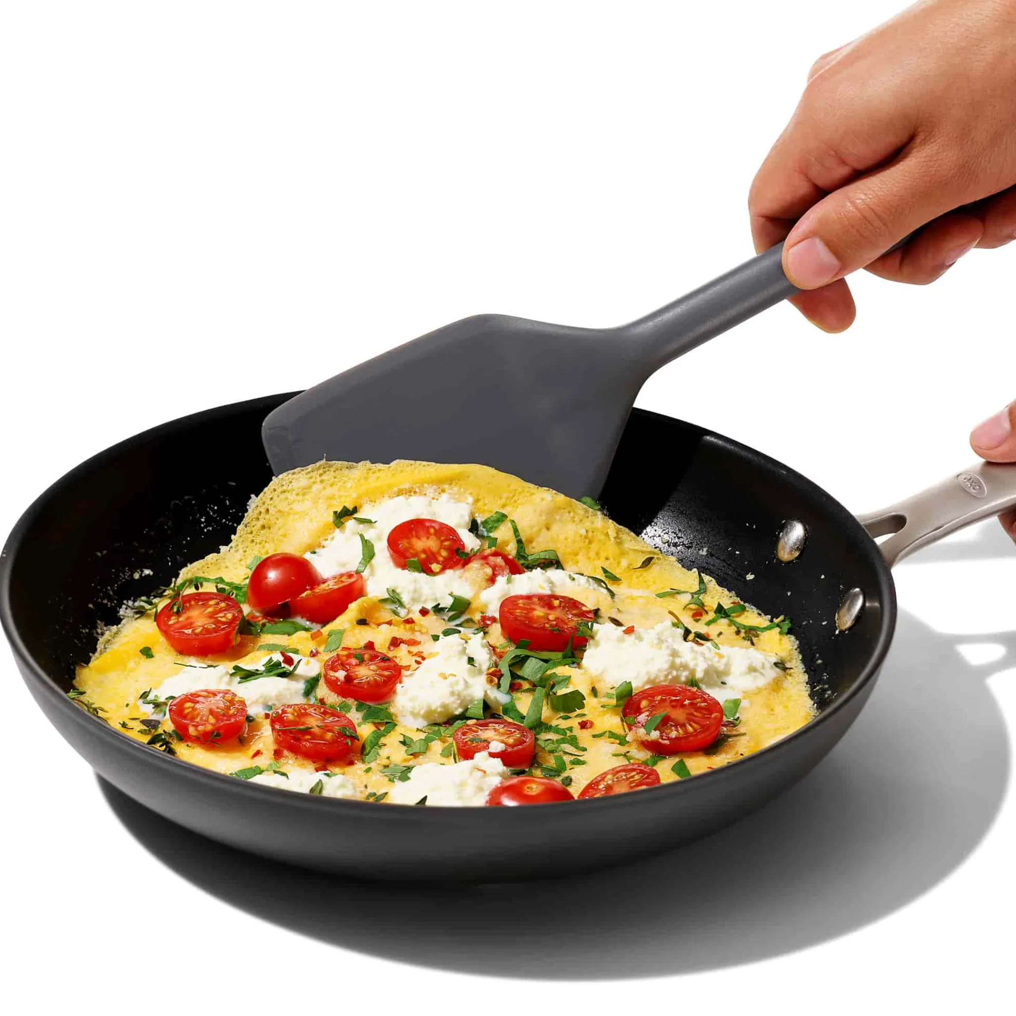 Use OXO’s grey silicone spatula to flip, turn and serve. It’s perfect for burgers, fried eggs and delicate fish fillets.