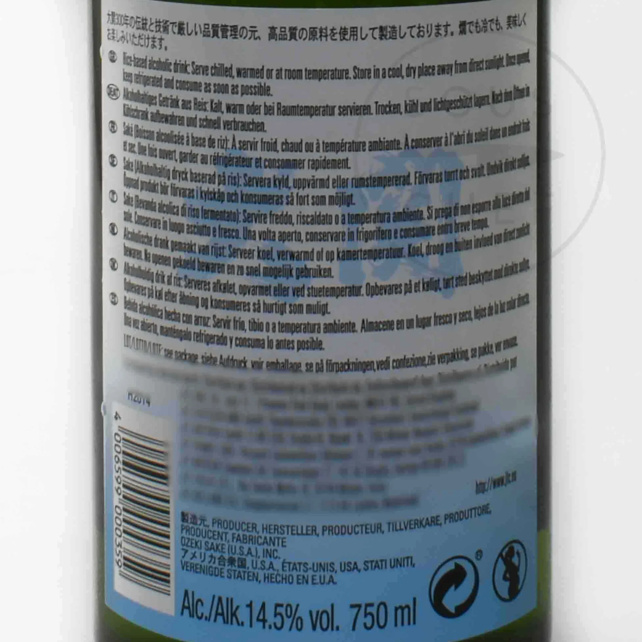 Sake is a Japanese wine made from fermented rice. This style of sake is best served chilled between 5-10°C, or gently warmed as ‘kansake’ to 40-46°C in a small carafe (‘tokkuri’). Producer Ozeki has been brewing sake since 1711 in Hyogo, central Japan. This Ozeki Junmai sake was one of their first sakes to be brewed in California in the USA, from 1979.