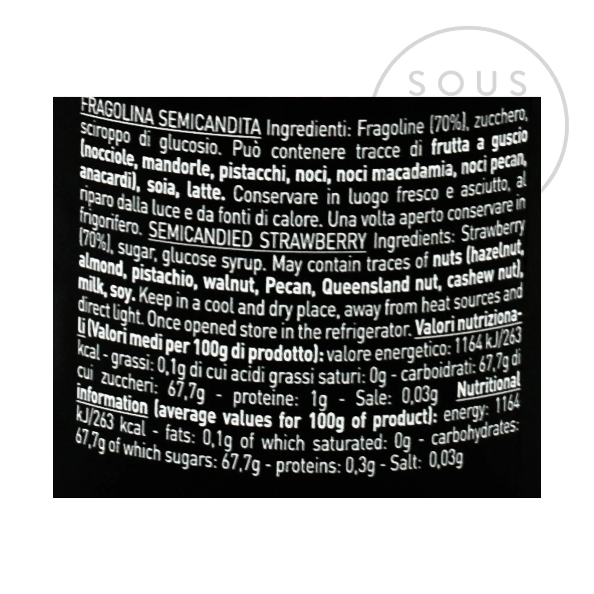 Pariani semi-candied wild strawberries are ideal for making patisserie-worthy strawberry tarts in a flash. Pariani’s exceptional cold candying process leaves the natural flavours of the wild strawberries unaltered. It also prevents the fruit freezing at low temperatures, so the wild strawberries stay soft even when swirled through homemade ice cream.