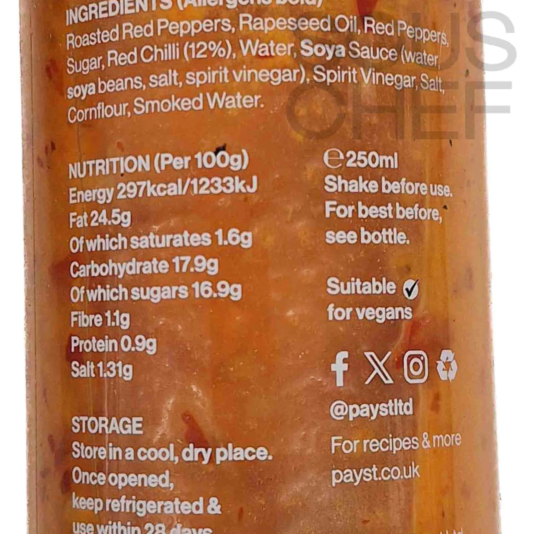 Product formulations and details may change. For the latest ingredients and allergen information always check product packaging prior to consumption. Ingredients: Roasted red bell peppers, rapeseed oil, red peppers, sugar, long red chilli, water, gluten free soy sauce (water, soybean, salt) white vinegar, salt, cornflour, smoked water