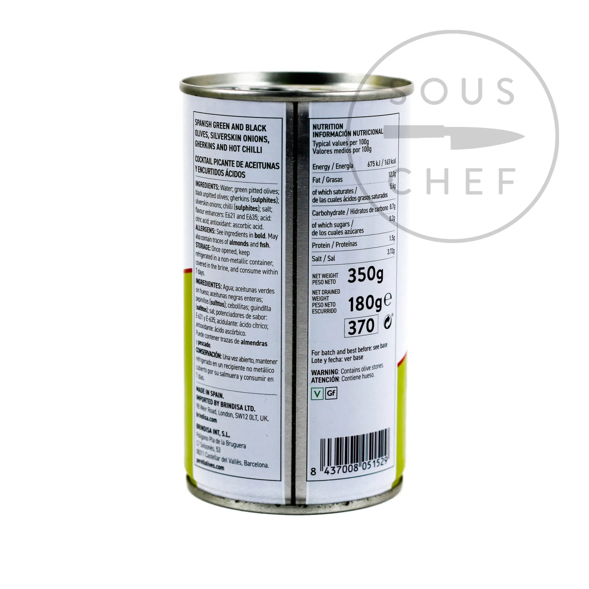 Product formulations and details may change. For the latest ingredients and allergen information always check product packaging prior to consumption. Ingredients: Water; green pitted olives; black unpitted olives; gherkins (sulphites); silverskin onions; chilli (sulphites); salt; flavour enhancers: E621 and E635; acid: citric acid; antioxidant: ascorbic acid.