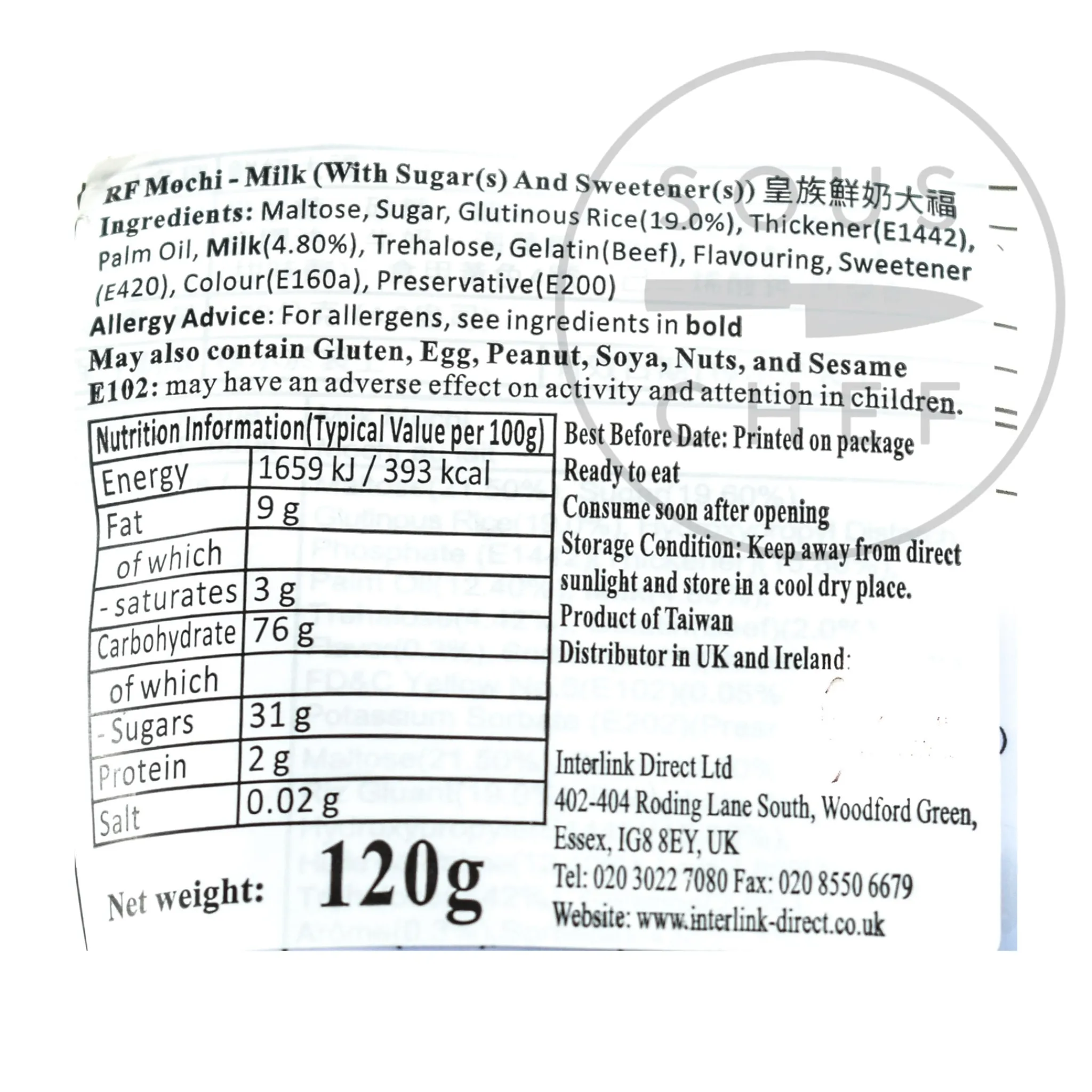 Product formulations and details may change. For the latest ingredients and allergen information always check product packaging prior to consumption. Ingredients: Maltose, sugar, glutinous rice (19%), thickener (E1442), palm oil, milk (4.8%), trehalose, gelatin (beef), flavouring, sweetener (E420), colour (E160a), preservative (E200)