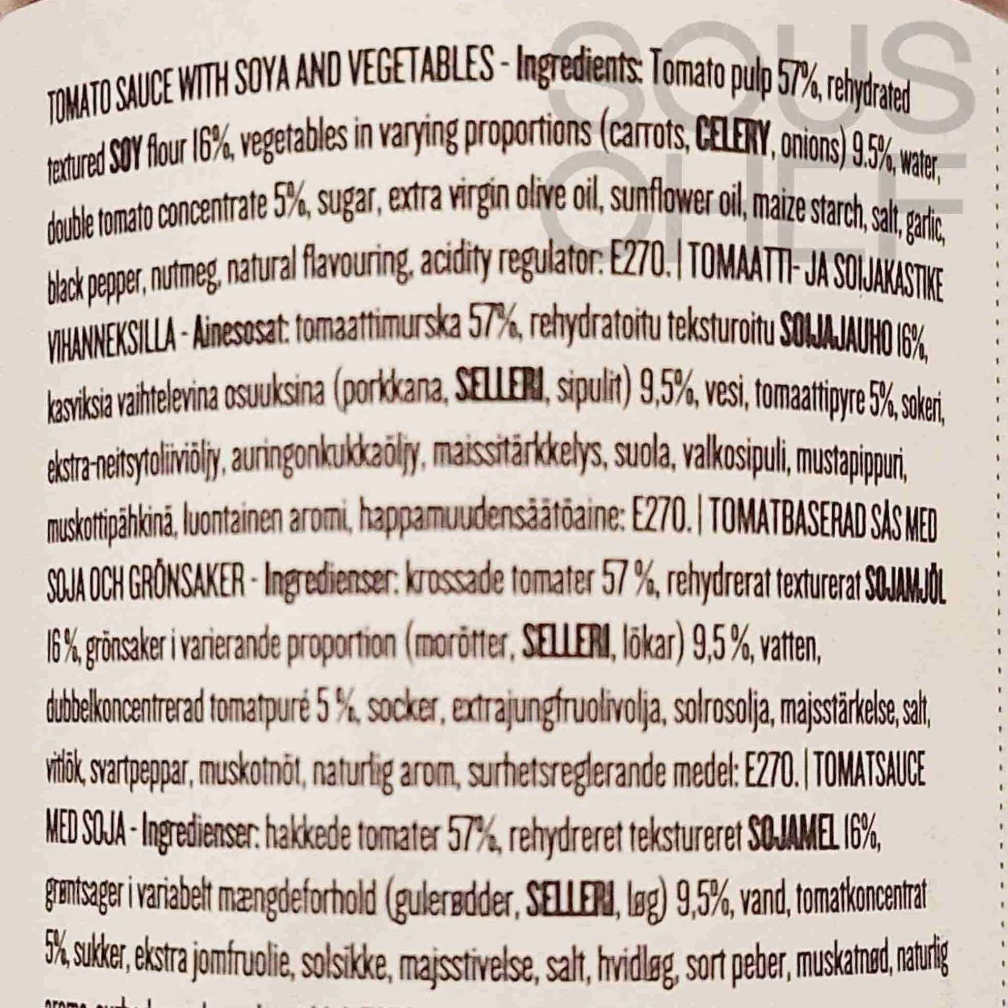 Product formulations and details may change. For the latest ingredients and allergen information always check product packaging prior to consumption. Ingredients: Tomato pulp 57%, rehydrated soy protein 16%, vegetables in variable proportions (carrots, celery, onions) 9.5%, water, 5% double tomato concentrate, sugar, extra virgin olive oil, sunflower oil, corn starch, salt, garlic, black pepper, nutmeg, natural flavor, acidity regulator: e270.