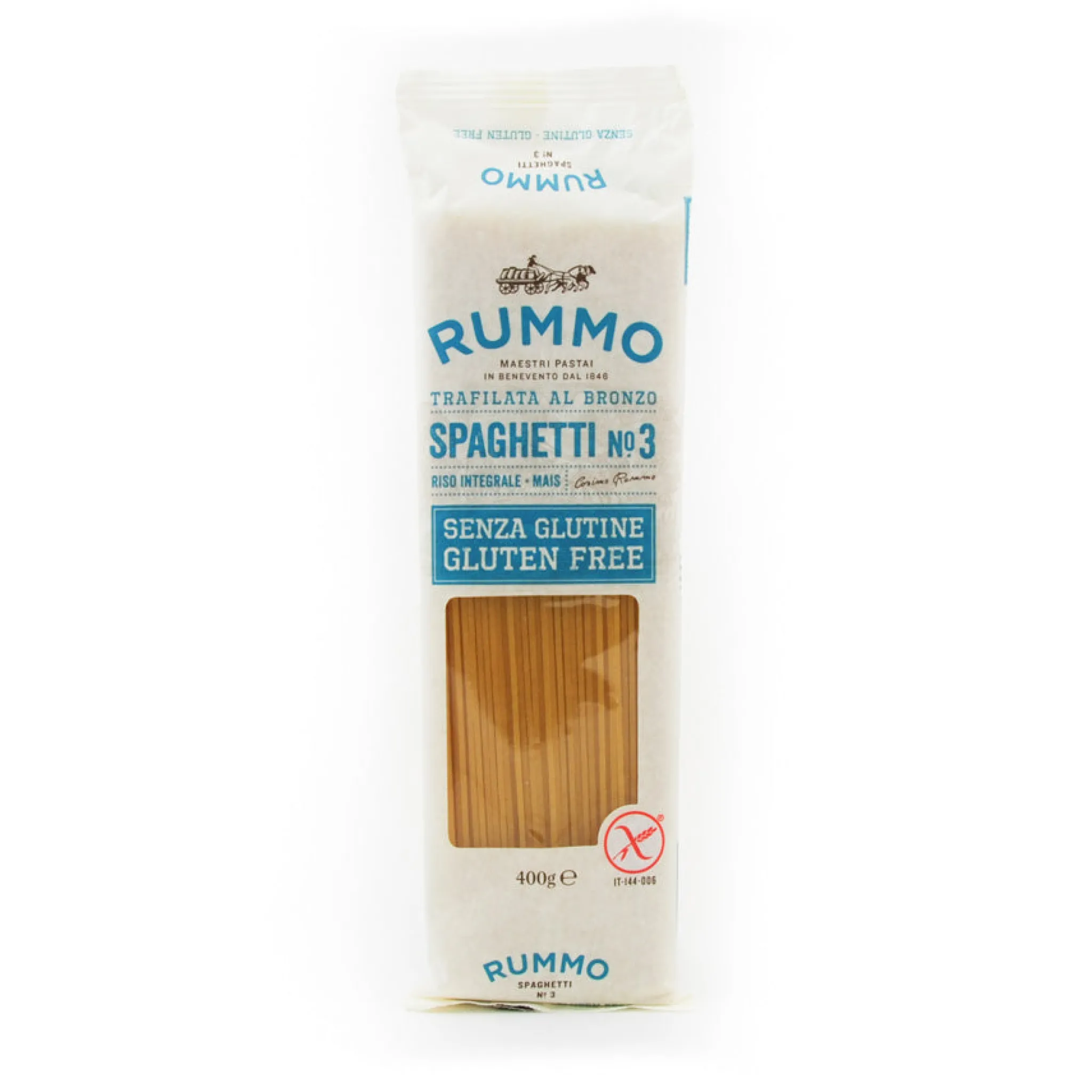Rummo spaghetti pasta no. 3 is one of the classic pasta shapes, now gluten-free. It is made with rice and GMO-free corn. The pasta shapes are drawn through a bronze die, to give the pasta a texture that your Bolognese sauce will cling to. Rummo gluten-free spaghetti pasta cooks in 10 minutes.
