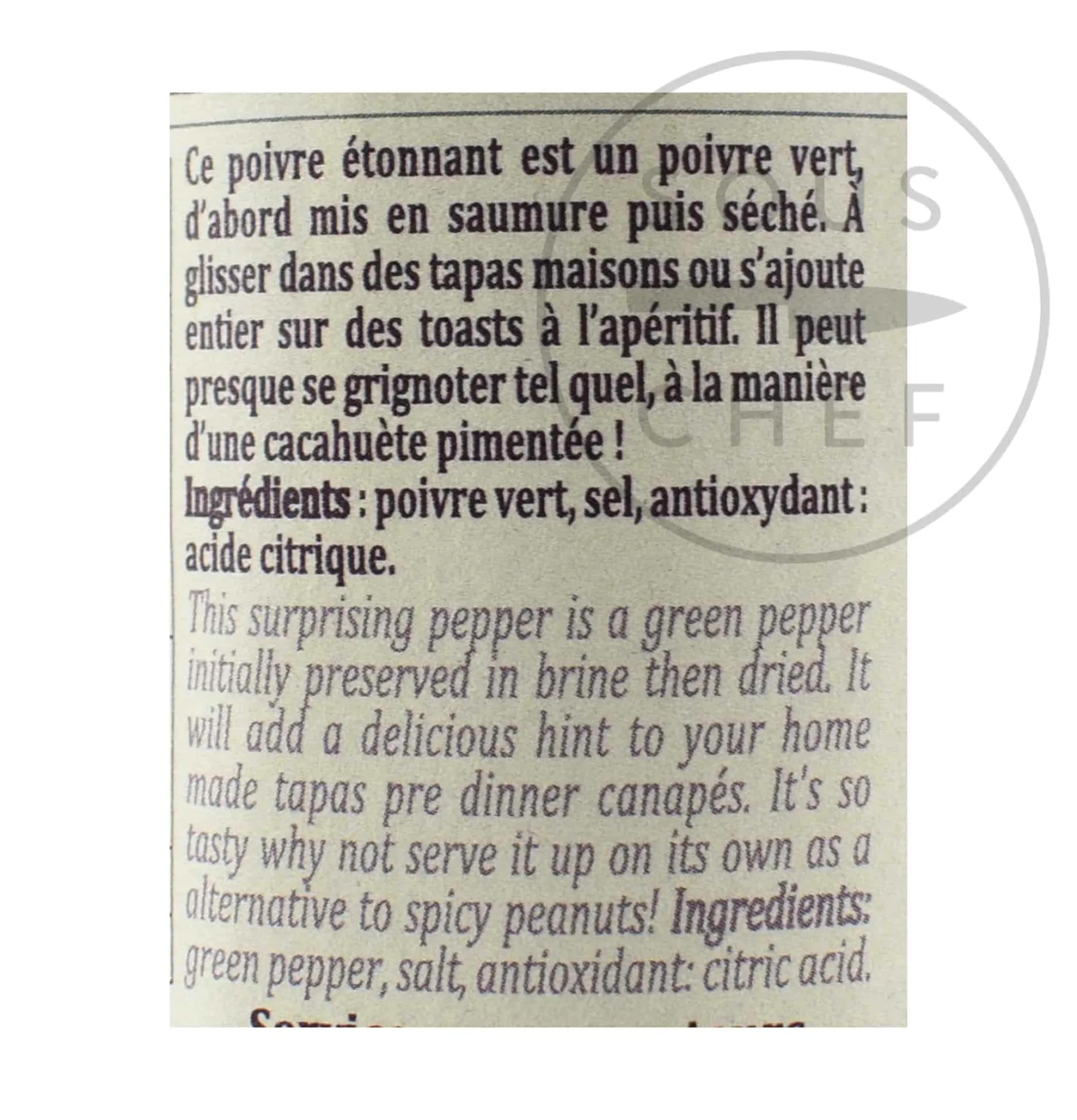 Product formulations and details may change. For the latest ingredients and allergen information always check product packaging prior to consumption. Ingredients: Green pepper, salt, antioxidant: citric acid. Possible traces of celery, sesame, mustard, nuts.