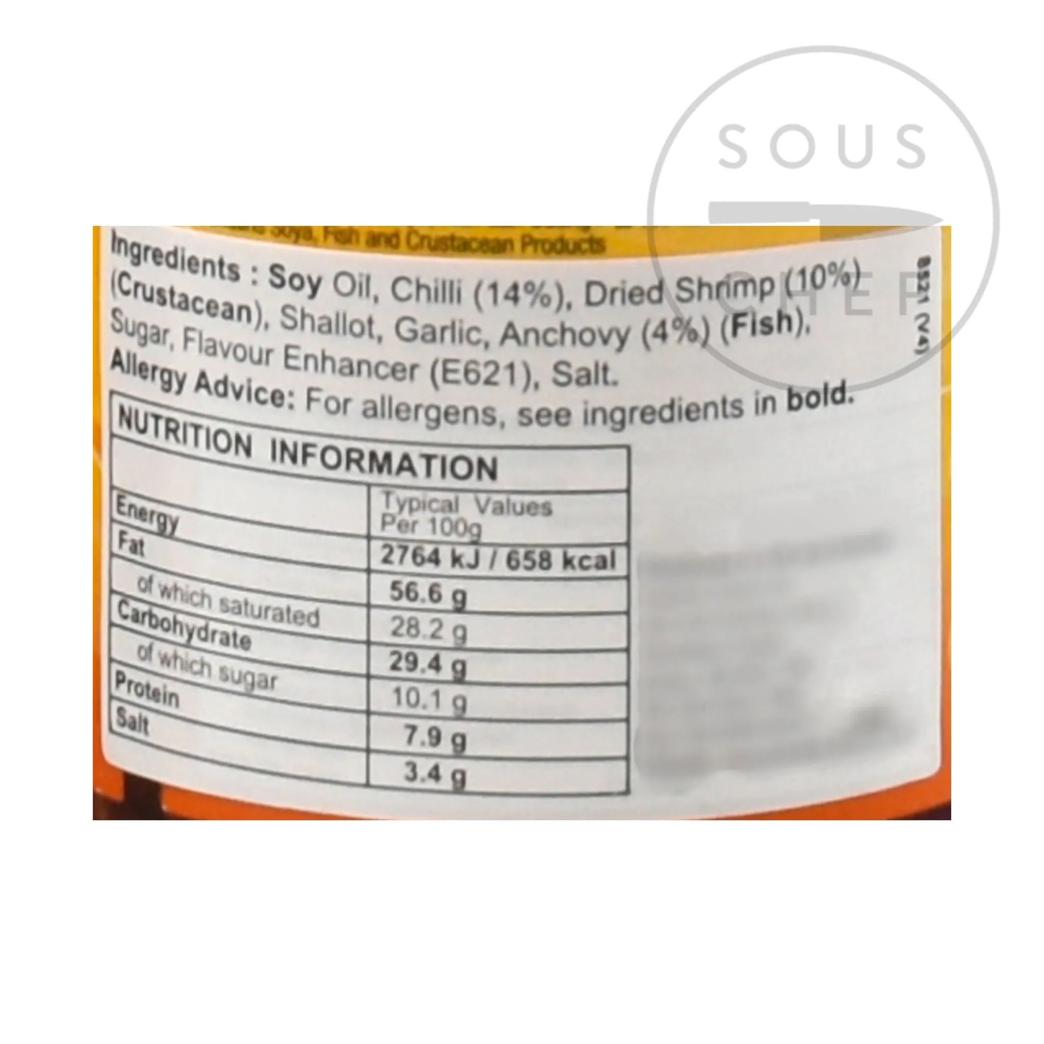 Product formulations and details may change. For the latest ingredients and allergen information always check product packaging prior to consumption. Ingredients: soy oil, chilli (14%), shrimp (10%), shallot, garlic, anchovy (4%), sugar, flavour enhancer (E621), salt. Contains allergens: soya, crustaceans, fish.