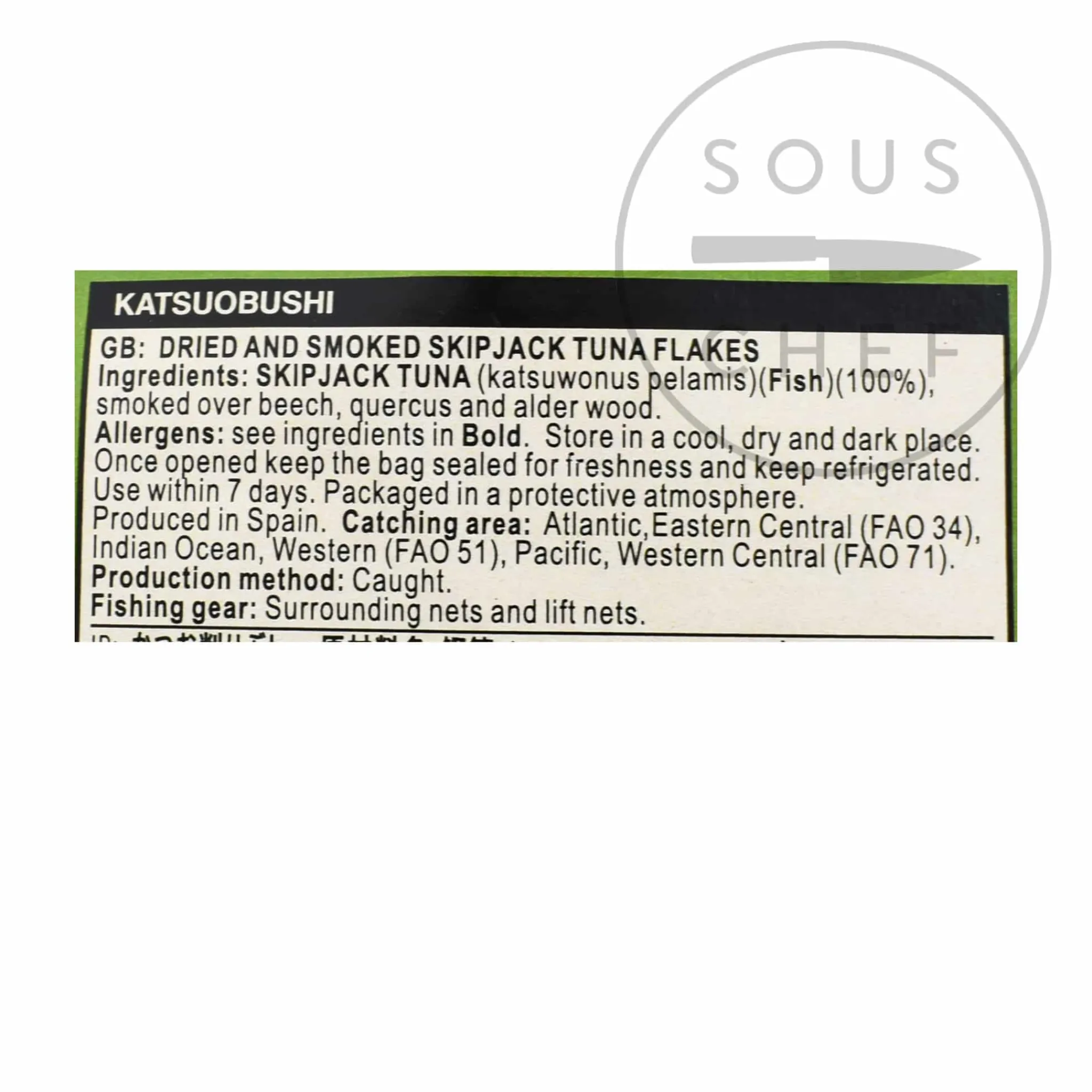Katsuo Bushi bonito flakes, or katsuobushi, are tissue-paper thin fish shavings with intense umami flavours. They come from a tuna-like Pacific fish which is dried, fermented to wood-like hardness and then smoked. Use along with dried kelp to form the base of the Japanese stock dashi.