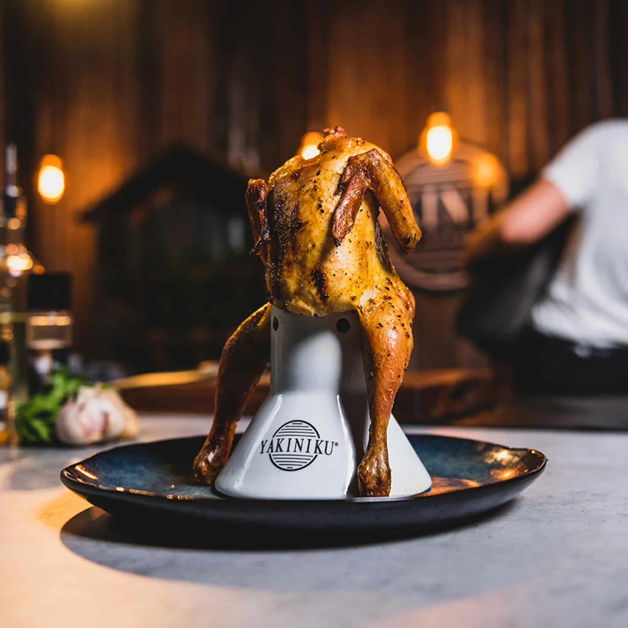 The stand holds your chicken in a sitting position while it cooks. Fill the stand with beer, wine or broth and let the flavour infuse the meat. As the liquid evaporates, the steam cooks the bird from the inside.