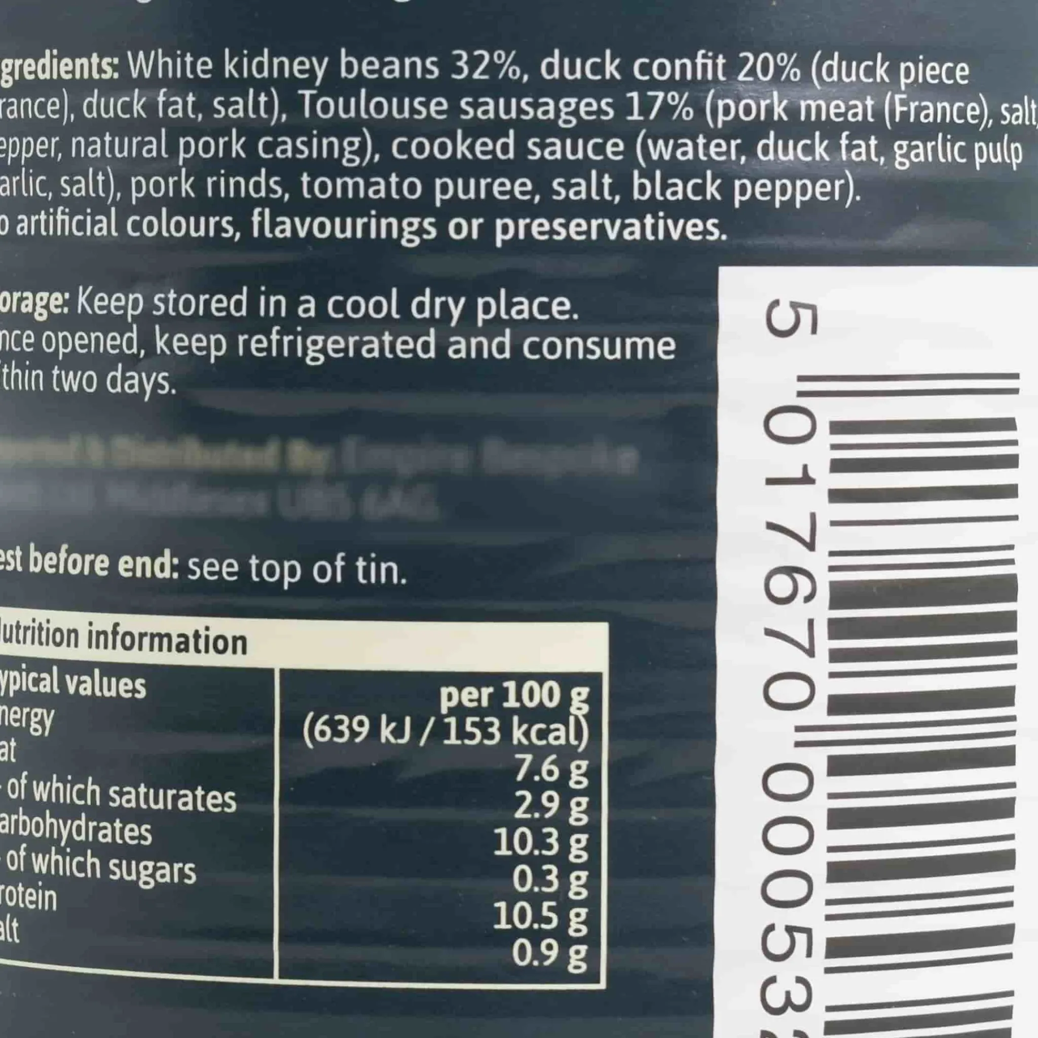 Product formulations and details may change. For the latest ingredients and allergen information always check product packaging prior to consumption. Ingredients: White kidney beans 32%, duck confit 20% (duck piece (france), duck fat, salt), toulouse sausages 17% (pork meat (france), salt, pepper, natural pork casing), cooked sauce (water, duck fat, garlic pulp (garlic, salt), pork rinds, tomato puree, salt, black pepper.