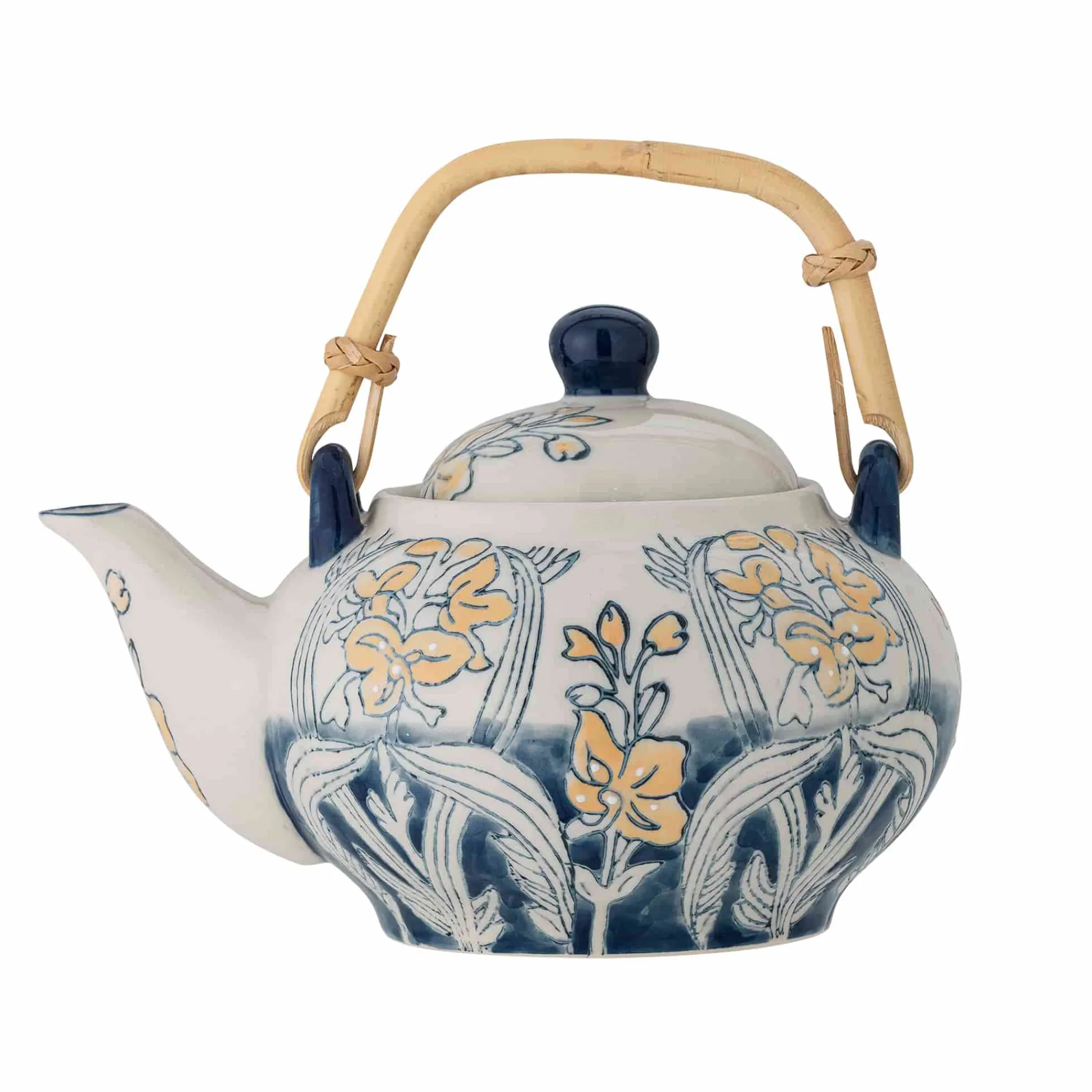 The Myah teapot has a rounded body and elegant pouring spout. It features a hand-painted floral motif in blue and pale orange. The colours are eye-catching but understated – perfect for modern homes.