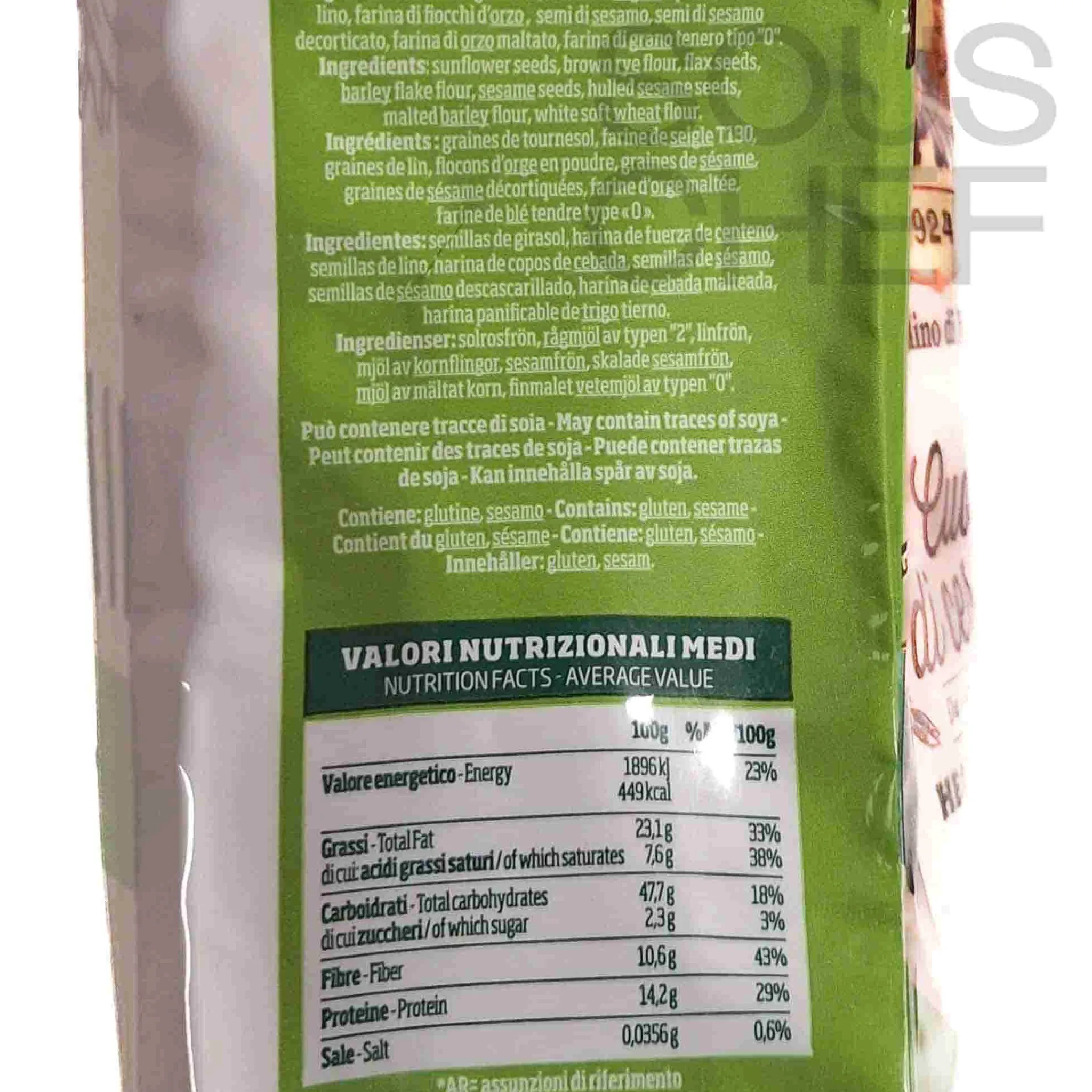 Product formulations and details may change. For the latest ingredients and allergen information always check product packaging prior to consumption. Ingredients: White soft wheat flour, sunflower seeds, brown rye flour type ‘2’, flax seeds, barley flake flour, sesame seeds, hulled sesame seeds, malted barley flour