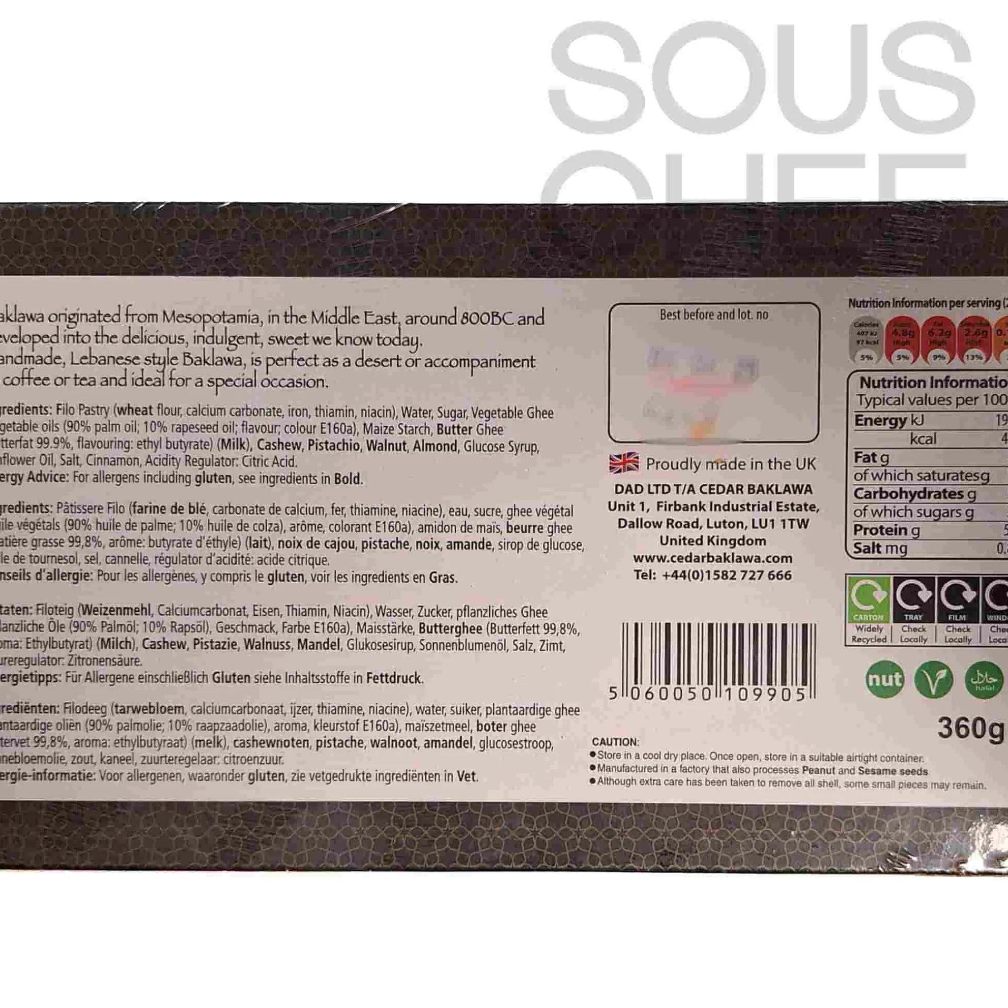 Product formulations and details may change. For the latest ingredients and allergen information always check product packaging prior to consumption. Ingredients: Filo pastry (wheat flour, calcium carbonate, iron, thiamin, niacin), water, sugar, vegetable ghee (vegetable oils (90% palm oil; 10% rapeseed oil; flavour colour e160a), maize starch, butter ghee (butterfat 99.9%, flavouring: ethyl butyrate) (milk), cashew, pistachio, walnut, almond, glucose syrup, sunflower oil, salt, cinnamon, acidity regulator: citric acid. Manufactured in a factory that also processes peanut and sesame seeds.