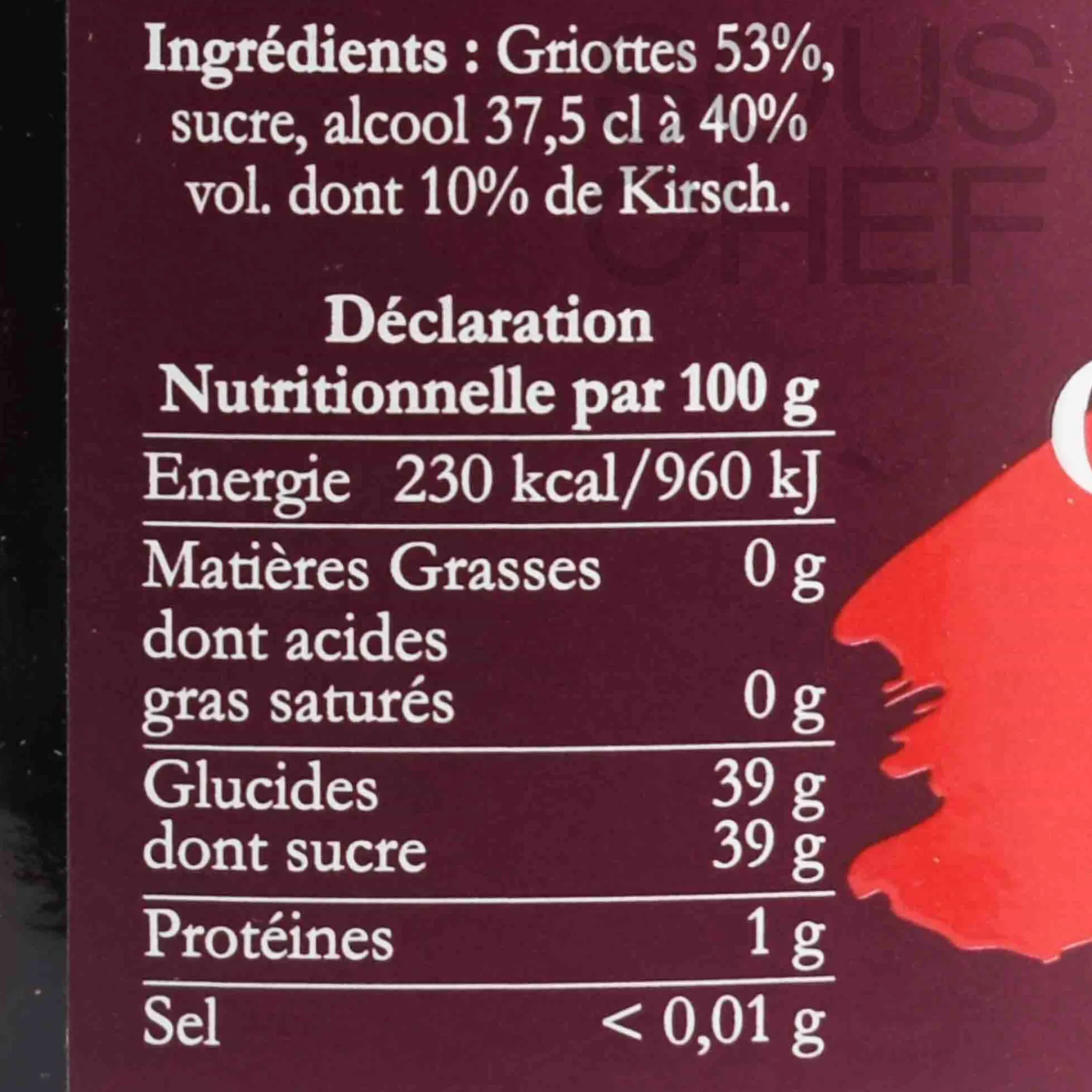 Product formulations and details may change. For the latest ingredients and allergen information always check product packaging prior to consumption. Ingredients: Morello cherries (53%), sugar, alcohol (of which Kirsch 10%). Contains alcohol at 15% ABV.
